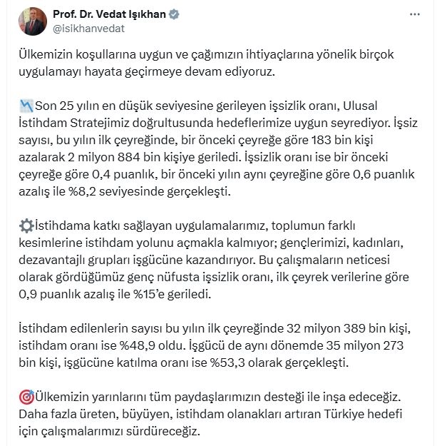 ANKARA, (DHA)- ÇALIŞMA ve Sosyal Güvenlik Bakanı Vedat Işıkhan, "Son 25 yılın en düşük seviyesine gerileyen işsizlik oranı, Ulusal İstihdam Stratejimiz doğrultusunda hedeflerimize uygun seyrediyor" dedi. Çalışma ve Sosyal Güvenlik Bakanı Vedat Işıkhan, 1'inci çeyrek iş gücü istatistiklerine ilişkin sosyal medya hesabından açıklama yaptı. Bakan Işıkhan, Türkiye'nin koşullarına uygun ve çağın ihtiyaçlarına yönelik birçok uygulamayı hayata geçirdiklerini belirtti. Mart ayında yüzde 7,9 oranla son 25 yılın en düşük seviyesine inen işsizlik oranına işaret eden Işıkhan, şunları kaydetti:"Son 25 yılın en düşük seviyesine gerileyen işsizlik oranı, Ulusal İstihdam Stratejimiz doğrultusunda hedeflerimize uygun seyrediyor. İşsiz sayısı, bu yılın ilk çeyreğinde, bir önceki çeyreğe göre 183 bin kişi azalarak 2 milyon 884 bin kişiye geriledi. İşsizlik oranı ise bir önceki çeyreğe göre 0,4 puanlık, bir önceki yılın aynı çeyreğine göre 0,6 puanlık azalış ile yüzde 8,2 seviyesinde gerçekleşti. İstihdama katkı sağlayan uygulamalarımız, toplumun farklı kesimlerine istihdam yolunu açmakla kalmıyor; gençlerimizi, kadınları, dezavantajlı grupları iş gücüne kazandırıyor. Bu çalışmaların neticesi olarak gördüğümüz genç nüfusta işsizlik oranı, ilk çeyrek verilerine göre 0,9 puanlık azalış ile yüzde 15'e geriledi. İstihdam edilenlerin sayısı bu yılın ilk çeyreğinde 32 milyon 389 bin kişi, istihdam oranı ise yüzde 48,9 oldu. İş gücü de aynı dönemde 35 milyon 273 bin kişi, iş gücüne katılma oranı ise yüzde 53,3 olarak gerçekleşti. Ülkemizin yarınlarını tüm paydaşlarımızın desteği ile inşa edeceğiz. Daha fazla üreten, büyüyen, istihdam olanakları artıran Türkiye hedefi için çalışmalarımızı sürdüreceğiz." (DHA)