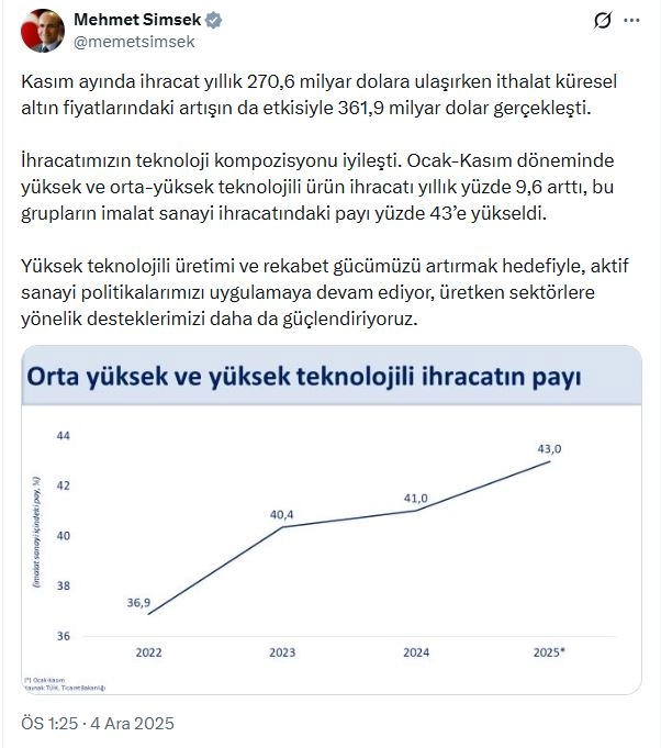 Hazine ve Maliye Bakanı Mehmet Şimşek, kasım ayı dış ticaret verilerine ilişkin sosyal medya hesabından açıklama yaptı. Bakan Şimşek, "Kasım ayında ihracat yıllık 270,6 milyar dolara ulaşırken ithalat küresel altın fiyatlarındaki artışın da etkisiyle 361,9 milyar dolar gerçekleşti. İhracatımızın teknoloji kompozisyonu iyileşti. Ocak-kasım döneminde yüksek ve orta-yüksek teknolojili ürün ihracatı yıllık yüzde 9,6 arttı, bu grupların imalat sanayi ihracatındaki payı yüzde 43'e yükseldi. Yüksek teknolojili üretimi ve rekabet gücümüzü artırmak hedefiyle, aktif sanayi politikalarımızı uygulamaya devam ediyor, üretken sektörlere yönelik desteklerimizi daha da güçlendiriyoruz" ifadelerini kullandı. (DHA)