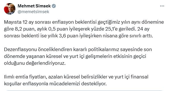 ANKARA, (DHA)- HAZİNE ve Maliye Bakanı Mehmet Şimşek, "Dezenflasyonu önceliklendiren kararlı politikalarımız sayesinde son dönemde yaşanan küresel ve yurt içi gelişmelerin etkisinin geçici olduğunu değerlendiriyoruz" dedi. Hazine ve Maliye Bakanı Mehmet Şimşek, piyasa katılımcıları anketi verilerine ilişkin sosyal medya hesabından açıklama yaptı. Bakan Şimşek, "Mayısta 12 ay sonrası enflasyon beklentisi geçtiğimiz yılın aynı dönemine göre 8,2 puan, aylık 0,5 puan iyileşerek yüzde 25,1'e geriledi. 24 ay sonrası beklenti ise yıllık 3,6 puan iyileşirken nisana göre sınırlı arttı. Dezenflasyonu önceliklendiren kararlı politikalarımız sayesinde son dönemde yaşanan küresel ve yurt içi gelişmelerin etkisinin geçici olduğunu değerlendiriyoruz. Ilımlı emtia fiyatları, azalan küresel belirsizlikler ve yurt içi finansal koşullar enflasyonla mücadelemizi destekliyor" ifadelerini kullandı. (DHA)