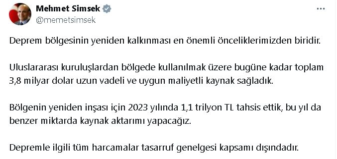 ANKARA, (DHA)- HAZİNE ve Maliye Bakanı Mehmet Şimşek, 6 Şubat depremlerinden etkilenen bölgelerin yeniden kalkınması için bugüne kadar uluslararası kuruluşlardan toplam 3,8 milyar dolar uzun vadeli ve uygun maliyetli kaynak sağladıklarını açıkladı.Bakan Mehmet Şimşek, sosyal medya hesabından yaptığı açıklamada, "Deprem bölgesinin yeniden kalkınması en önemli önceliklerimizden biridir. Uluslararası kuruluşlardan bölgede kullanılmak üzere bugüne kadar toplam 3,8 milyar dolar uzun vadeli ve uygun maliyetli kaynak sağladık. Bölgenin yeniden inşası için 2023 yılında 1,1 trilyon TL tahsis ettik. Bu yıl da benzer miktarda kaynak aktarımı yapacağız. Depremle ilgili tüm harcamalar Tasarruf Genelgesi kapsamı dışındadır" ifadelerini kullandı. (DHA)