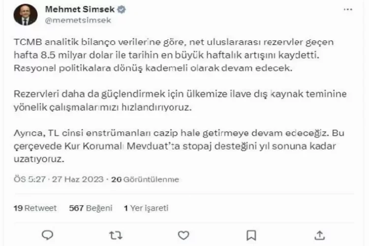 Bakan Şimşek, Twitter hesabından açıklama yaptı. Şimşek, "TCMB analitik bilanço verilerine göre, net uluslararası rezervler geçen hafta 8,5 milyar dolar ile tarihin en büyük haftalık artışını kaydetti. Rasyonel politikalara dönüş kademeli olarak devam edecek. Rezervleri daha da güçlendirmek için ülkemize ilave dış kaynak teminine yönelik çalışmalarımızı hızlandırıyoruz. Ayrıca, TL cinsi enstrümanları cazip hale getirmeye devam edeceğiz. Bu çerçevede Kur Korumalı Mevduat’ta stopaj desteğini yıl sonuna kadar uzatıyoruz" ifadelerini kullandı. (DHA)