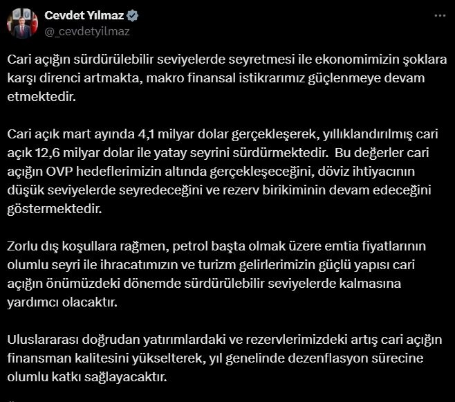ANKARA, (DHA)- CUMHURBAŞKANI Yardımcısı Cevdet Yılmaz, "Cari açığın sürdürülebilir seviyelerde seyretmesi ile ekonomimizin şoklara karşı direnci artmakta, makro finansal istikrarımız güçlenmeye devam etmektedir" dedi.Cumhurbaşkanı Yardımcısı Cevdet Yılmaz, mart ayı ödemeler dengesi istatistiklerine ilişkin sosyal medya hesabından açıklama yaptı. Yılmaz, "Cari açığın sürdürülebilir seviyelerde seyretmesi ile ekonomimizin şoklara karşı direnci artmakta, makro finansal istikrarımız güçlenmeye devam etmektedir. Cari açık mart ayında 4,1 milyar dolar gerçekleşerek, yıllıklandırılmış cari açık 12,6 milyar dolar ile yatay seyrini sürdürmektedir. Bu değerler, cari açığın OVP (Orta Vadeli Program) hedeflerimizin altında gerçekleşeceğini, döviz ihtiyacının düşük seviyelerde seyredeceğini ve rezerv birikiminin devam edeceğini göstermektedir. Zorlu dış koşullara rağmen, petrol başta olmak üzere emtia fiyatlarının olumlu seyri ile ihracatımızın ve turizm gelirlerimizin güçlü yapısı, cari açığın önümüzdeki dönemde sürdürülebilir seviyelerde kalmasına yardımcı olacaktır. Uluslararası doğrudan yatırımlardaki ve rezervlerimizdeki artış, cari açığın finansman kalitesini yükselterek, yıl genelinde dezenflasyon sürecine olumlu katkı sağlayacaktır" dedi. (DHA)