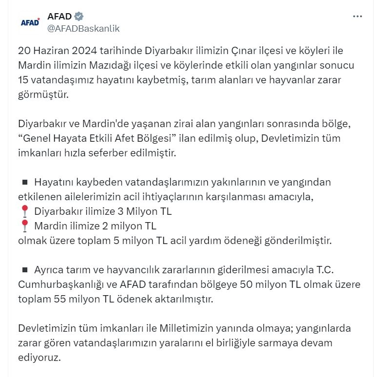 ANKARA, (DHA)- AFET ve Acil Durum Yönetimi Başkanlığı (AFAD), 20 Haziran'da Diyarbakır ve Mardin arasında çıkan yangın nedeniyle bölgeye 55 milyon TL ödenek aktarıldığını duyurdu.AFAD'ın sosyal medya hesabından yapılan açıklamada, 20 Haziran 2024 tarihinde Diyarbakır'ın Çınar ilçesi ve köyleri ile Mardin'in Mazıdağı ilçesi ve köylerinde etkili olan yangınlar sonucu 15 kişinin hayatını kaybettiği ve tarım alanları ile hayvanların zarar gördüğü hatırlatılarak, "Diyarbakır ve Mardin'de yaşanan zirai alan yangınları sonrasında bölge, 'Genel Hayata Etkili Afet Bölgesi' ilan edilmiş olup, devletimizin tüm imkanları hızla seferber edilmiştir. Hayatını kaybeden vatandaşlarımızın yakınlarının ve yangından etkilenen ailelerimizin acil ihtiyaçlarının karşılanması amacıyla, Diyarbakır ilimize 3 milyon TL, Mardin ilimize 2 milyon TL olmak üzere toplam 5 milyon TL acil yardım ödeneği gönderilmiştir" denildi.TARIM VE HAYVANCILIK ZARARLARI İÇİN 50 MİLYON TLAyrıca tarım ve hayvancılık zararlarının giderilmesi amacıyla Cumhurbaşkanlığı ve AFAD tarafından bölgeye 50 milyon TL olmak üzere toplamda 55 milyon TL ödenek aktarıldığı vurgulanarak, "Devletimizin tüm imkanları ile milletimizin yanında olmaya; yangınlarda zarar gören vatandaşlarımızın yaralarını el birliğiyle sarmaya devam ediyoruz. Hayatını kaybeden vatandaşlarımıza bir kez daha Allah’tan rahmet, yakınlarına ve ailelerine başsağlığı diliyor; yangından etkilenen tüm vatandaşlarımıza geçmiş olsun dileklerimizi sunuyoruz" ifadelerine yer verildi. (DHA)