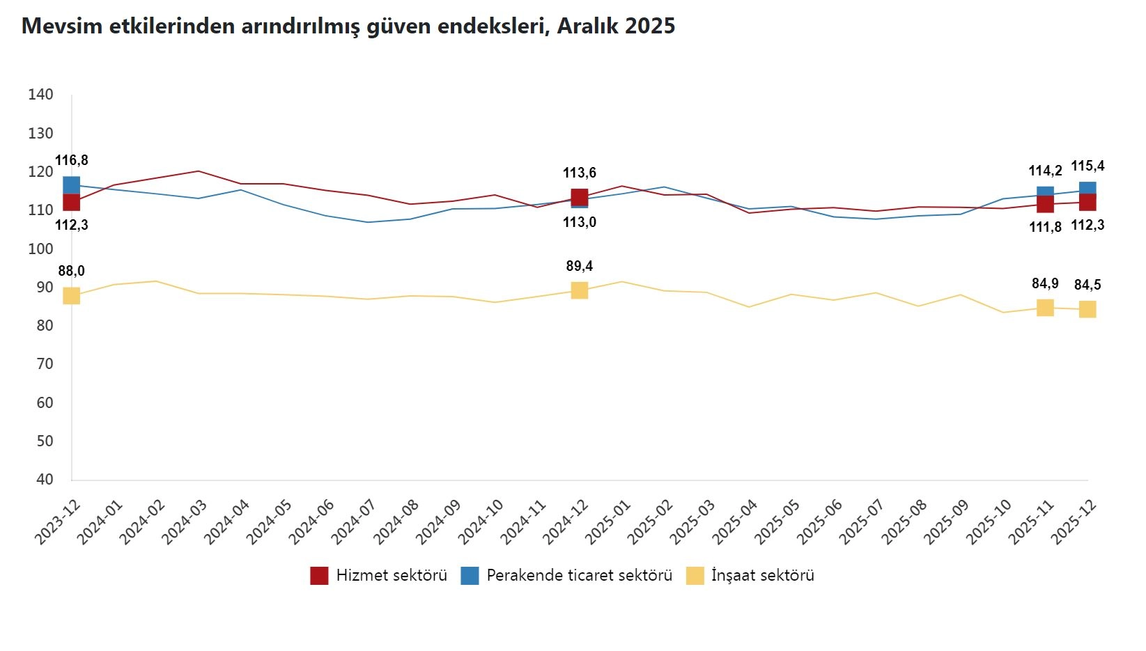 TÜİK, Aralık 2025 dönemine ilişkin hizmet, perakende ticaret ve inşaat güven endekslerini açıkladı. Buna göre; güven endeksi aralık ayında bir önceki aya göre; hizmet sektöründe yüzde 0,4 oranında artarak 112,3 değerini, perakende ticaret sektöründe yüzde 1,1 oranında artarak 115,4 değerini ve inşaat sektöründe yüzde 0,5 oranında azalarak 84,5 değerini aldı. (DHA)