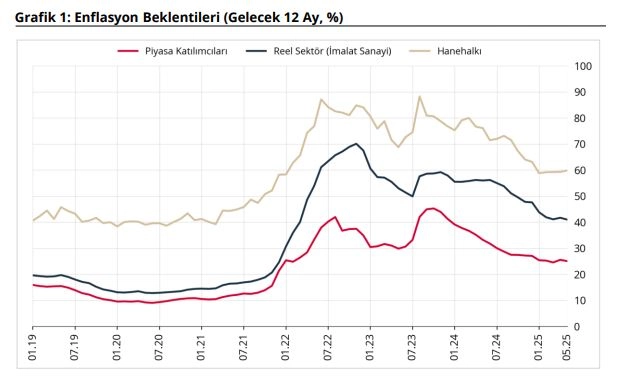 Caner ÜNVER/ANKARA, (DHA)- TÜRKİYE Cumhuriyet Merkez Bankası (TCMB), 12 ay sonrası yıllık enflasyon beklentilerinin piyasa katılımcıları ve reel sektör için azaldığını, hanehalkı içinse arttığını açıkladı.TCMB, Mayıs 2025 dönemine ilişkin sektörel enflasyon beklentilerini açıkladı. Buna göre; mayıs ayında 12 ay sonrası yıllık enflasyon beklentileri bir önceki aya göre, piyasa katılımcıları için 0,5 puan azalarak yüzde 25,1 seviyesine, reel sektör için 0,7 puan azalarak yüzde 41 seviyesine gerilerken; hanehalkı için 0,6 puan artarak yüzde 59,9 seviyesine yükseldi. Gelecek 12 aylık dönemde enflasyonun düşeceğini bekleyen hanehalkı oranı bir önceki aya göre 0,6 puan artarak yüzde 27,8 seviyesinde gerçekleşti. (DHA)