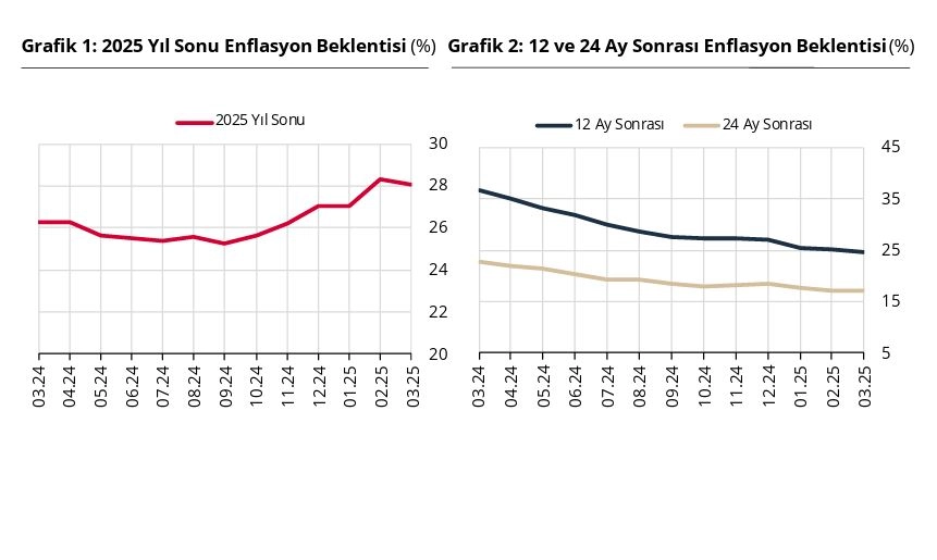 Caner ÜNVER/ANKARA,(DHA)- TÜRKİYE Cumhuriyet Merkez Bankası (TCMB), piyasa katılımcılarının yıl sonu enflasyon beklentisinin yüzde 28,04'e gerilediğini açıkladı.TCMB, Mart 2025 dönemine ilişkin 'Piyasa Katılımcıları Anketi' verilerini açıkladı. Buna göre; piyasa katılımcılarının cari yıl sonu tüketici enflasyonu (TÜFE) beklentisi bir önceki anket döneminde yüzde 28,30 iken, bu anket döneminde yüzde 28,04 oldu. 12 ay sonrası TÜFE beklentisi bir önceki anket döneminde yüzde 25,26 iken, bu anket döneminde yüzde 24,55 oldu. 24 ay sonrası TÜFE beklentisi ise 17,26'dan yüzde 17,06'ya geriledi.DÖVİZ KURU VE FAİZ BEKLENTİLERİKatılımcıların cari yıl sonu dolar/TL beklentisi bir önceki anket döneminde 42,89 TL iken, bu anket döneminde 42,79 TL oldu. 12 ay sonrası döviz kuru beklentisi ise bir önceki anket döneminde 43,96 TL iken, bu anket döneminde 44,42 TL olarak gerçekleşti. TCMB'nin politika faizine ilişkin cari ay sonu beklentisi ise bu anket döneminde yüzde 42,50 oldu.Katılımcıların 2025 yılı büyüme beklentisi bir önceki anket döneminde yüzde 3 iken, bu anket döneminde yüzde 3,1 olarak gerçekleşti. 2026 yılı büyüme beklentisi ise bir önceki anket döneminde yüzde 3,9 iken, bu anket döneminde yüzde 4 olarak gerçekleşti. (DHA)