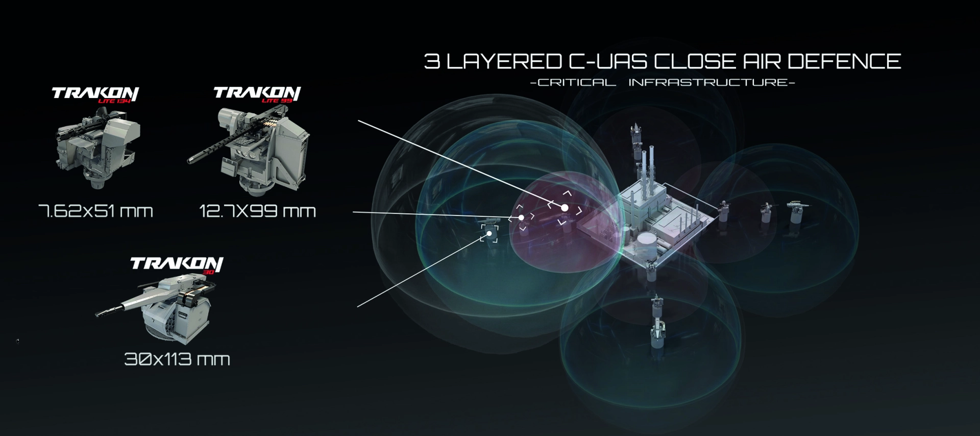 Söz konusu savunma mimarisi, farklı menzil katmanlarında yüksek imha kabiliyeti sunan temel bileşenlerden oluşuyor. UNIROBOTICS, yüksek hassasiyetli TRAKON RCWS (Uzaktan Komutalı Silah Sistemleri) ile dijital entegrasyonu sağlıyor ve sistemin omurgasında yer alıyor. CANiK, dakikada 1200 atım hızına ulaşan CANiK M3, dakikada 950 atım hızına ulaşan M2F ve dakikada 650 atım hızına ulaşan M2 QCB ağır makineli tüfek ailesi caydırıcılık sağlıyor. AEI Systems'ın düşük geri tepmeli ve ayarlanabilir atım hızına sahip VENOM LR (30x113 mm) orta kalibre topu ile ateş gücü üst seviyeye çıkıyor.