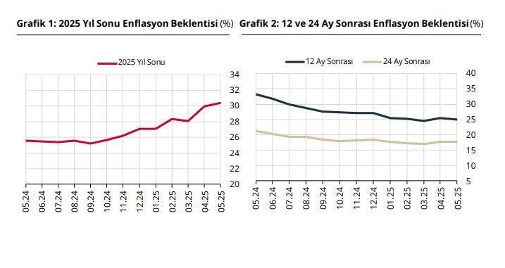 ANKARA, (DHA)- TÜRKİYE Cumhuriyet Merkez Bankası (TCMB), piyasa katılımcılarının tüketici enflasyonu (TÜFE) beklentilerinin yıl sonu için yüzde 30,35'e yükseldiğini, 12 ay sonrası için yüzde 25,06'ya gerilediğini ve 24 ay sonrası için 17,77'ye yükseldiğini açıkladı.TCMB, Mayıs 2025 dönemine ilişkin piyasa katılımcıları anketi verilerini açıkladı. Buna göre; katılımcıların cari yıl sonu TÜFE beklentisi, bir önceki anket döneminde yüzde 29,98 iken bu anket döneminde yüzde 30,35'ye çıktı. 12 ay sonrası TÜFE beklentisi, 25,56'dan yüzde 25,06'ya geriledi. 24 ay sonrası TÜFE beklentisi ise 17,69'dan 17,77'ye yükseldi.FAİZ BEKLENTİLERİPiyasa katılımcılarının cari yıl sonu dolar kuru beklentisi, bir önceki anket dönemindeki 43,60 TL seviyesinden 43,70 TL'ye yükseldi. 12 ay sonrası dolar kuru beklentisi ise 45,85 TL'den 46,62 TL'ye çıktı. Katılımcıların cari ay sonu gecelik faiz oranı beklentisi, bir önceki anket döneminde yüzde 46 olurken, bu anket döneminde yüzde 49'a yükseldi. 3 ay sonrası faiz beklentisi ise 39,24'ten yüzde 42,96'ya yükseldi. BÜYÜME BEKLENTİLERİKatılımcıların 2025 yılı büyüme beklentisi, bir önceki anket döneminde yüzde 3 iken bu anket döneminde yüzde 2,9 olarak gerçekleşti. 2026 yılı büyüme beklentisi ise bir önceki anket döneminde yüzde 3,8'den 3,7'ye geriledi. (DHA)