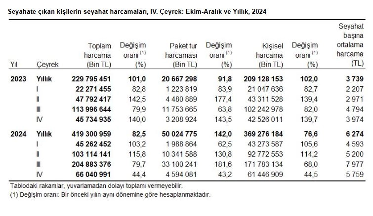 ANKARA, (DHA)-TÜRKİYE İstatistik Kurumu (TÜİK), 2024 yılında 66 milyon 836 bin yerli turistin yaptığı seyahat harcamasının önceki yıla göre yüzde 82,5 artarak 419 milyar 300 milyon 959 bin TL olduğunu açıkladı. TÜİK, 2024 yılı 4'üncü çeyreğine ilişkin hanehalkı yurt içi turizm istatistiklerini açıkladı. Buna göre; ekim, kasım ve aralık aylarından oluşan 4'üncü çeyrekte, yurt içinde ikamet eden 9 milyon 528 bin kişi seyahate çıktı. Seyahate çıkanların bir ve daha fazla geceleme kaydı ile ülke içinde yaptıkları toplam seyahat sayısı bir önceki yılın aynı çeyreğine göre yüzde 0,4 azalarak 11 milyon 467 bin seyahat olarak gerçekleşti. Bu çeyrekte seyahate çıkanlar, 76 milyon 576 bin geceleme yaptı. Ortalama geceleme sayısı 6,7 gece oldu. Yıllık olarak değerlendirildiğinde; 2024 yılında toplam seyahat sayısı bir önceki yıla göre yüzde 8,7 artarak 66 milyon 836 bin olarak gerçekleşti. Bu yılda seyahate çıkanların yaptıkları toplam geceleme sayısı bir önceki yıla göre yüzde 2,3 artarak 484 milyon 141 bin olarak gerçekleşti. Ortalama geceleme sayısı 7,2 gece oldu.SEYAHATE ÇIKANLAR, 66 MİLYAR 40 MİLYON 991 BİN TL HARCADIYerli turistlerin, yurt içinde yaptıkları seyahat harcamaları, 2024 yılının 4'üncü çeyreğinde bir önceki yılın aynı çeyreğine göre yüzde 44,4 artarak 66 milyar 40 milyon 991 bin TL olarak gerçekleşti. Bu harcamaların yüzde 93'ünü 61 milyar 446 milyon 909 bin TL ile kişisel harcamalar, yüzde 7'sini 4 milyar 594 milyon 81 bin TL ile paket tur harcamaları oluşturdu. Seyahat başına yapılan ortalama harcama 5 bin 759 TL oldu. Bu yıl, yurt içindeki seyahatlerde yapılan toplam seyahat harcamaları geçen yıla göre yüzde 82,5 artarak 419 milyar 300 milyon 959 bin TL oldu. Bu harcamaların yüzde 88,1'ini 369 milyar 276 milyon 184 bin TL ile kişisel harcamalar, yüzde 11,9'unu ise 50 milyar 24 milyon 775 bin TL ile paket tur harcamaları oluşturdu. Seyahat başına ortalama harcama 6 bin 274 TL oldu. EN FAZLA PAY YEME VE İÇME HARCAMALARINDABu çeyrekte, harcama türlerinin toplam seyahat harcamaları içerisindeki dağılım oranları incelendiğinde; en fazla paya yüzde 33,8 ile yeme ve içme harcamaları, yüzde 27,7 ile ulaştırma harcamaları ve yüzde 12,1 ile konaklama harcamaları sahip oldu. Bu harcama türlerinin geçen yılın aynı dönemine göre değişim oranları incelendiğinde; yeme ve içme harcamalarında yüzde 61,4, ulaştırma harcamalarında yüzde 33,6 ve konaklama harcamalarında ise yüzde 50,3'lük artış görüldü. Yıllık olarak harcama türlerinin seyahat harcamaları içerisindeki dağılım oranları incelendiğinde; en fazla paya yüzde 31,8 ile yeme ve içme harcamaları, yüzde 24,3 ile ulaştırma harcamaları ve yüzde 16,7 ile konaklama harcamaları sahip oldu. Bu harcama türlerinin geçen yıla göre değişim oranları incelendiğinde; yeme ve içme harcamalarında yüzde 81, ulaştırma harcamalarında yüzde 68,7 ve konaklama harcamalarında ise yüzde 78,8'lik artış görüldü.YAKINLARI ZİYARET AMACIYLA YAPILAN SEYAHATLER İLK SIRADABu çeyrekte, yakınları ziyaret amacı ile yapılan seyahatler yüzde 63,1 ile ilk sırada yer aldı. Bu çeyrekte, seyahate çıkış amaçlarında ikinci sırada yüzde 25,6 ile gezi, eğlence, tatil, üçüncü sırada yüzde 6,5 ile yüzde sağlık yer aldı. Seyahate çıkış amaçları yıllık olarak değerlendirildiğinde; yüzde 57,2 ile yakınları ziyaret birinci sırada yer alırken, ikinci sırada yüzde 35,3 ile gezi, eğlence, tatil, üçüncü sırada yüzde 3,7 ile sağlık amacıyla yapılan seyahatler yer aldı.SEYAHATE ÇIKANLAR EN ÇOK ARKADAŞ VEYA AKRABA EVİNDE KALDIBu çeyrekte, seyahate çıkanlar 53 milyon 250 bin geceleme sayısı ile en çok arkadaş veya akraba evinde kaldı. Konaklama türlerine göre geceleme sayısında ikinci sırada 13 milyon 292 bin geceleme ile kendi evi yer alırken, otel 5 milyon 218 bin geceleme sayısı ile üçüncü sırada yer aldı. Konaklama türleri yıllık olarak değerlendirildiğinde; seyahate çıkanlar 328 milyon 972 bin geceleme sayısı ile en çok arkadaş veya akraba evinde kaldı. İkinci sırada 77 milyon 911 bin geceleme ile kendi evi yer alırken, otel 44 milyon 516 bin geceleme sayısı ile üçüncü sırada yer aldı. (DHA)