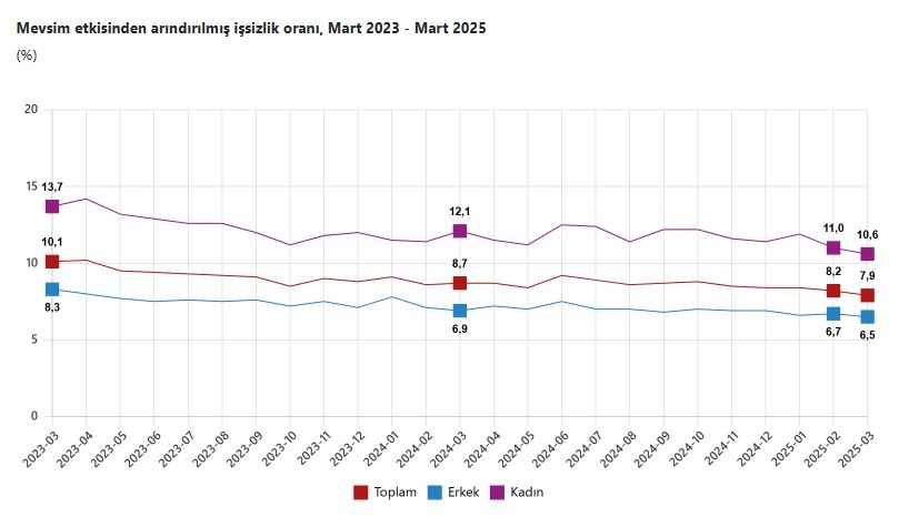 Caner ÜNVER/ANKARA, (DHA)- TÜRKİYE İstatistik Kurumu (TÜİK), mart ayında işsizlik oranının bir önceki aya göre 0,3 puan azalarak yüzde 7,9 seviyesinde gerçekleştiğini açıkladı. TÜİK, Mart 2025 dönemine ilişkin iş gücü istatistiklerini açıkladı. Buna göre; 15 ve daha yukarı yaştaki kişilerde işsiz sayısı, bir önceki aya göre 65 bin kişi azalarak 2 milyon 807 bin kişi oldu. İşsizlik oranı ise 0,3 puan azalarak yüzde 7,9 seviyesinde gerçekleşti. İşsizlik oranı erkeklerde yüzde 6,5, kadınlarda yüzde 10,6 kaydedildi. İstihdam edilenlerin sayısı, bir önceki aya göre 391 bin kişi artarak 32 milyon 597 bin kişi, istihdam oranı ise 0,6 puan artarak yüzde 49,2 oldu. Bu oran erkeklerde yüzde 66,9, kadınlarda yüzde 31,9 olarak gerçekleşti. İş gücü, bir önceki aya göre 325 bin kişi artarak 35 milyon 404 bin kişi, iş gücüne katılma oranı ise 0,4 puan artarak yüzde 53,4 olarak gerçekleşti. İş gücüne katılma oranı erkeklerde yüzde 71,6 iken, kadınlarda yüzde 35,7 oldu.GENÇ NÜFUSTA İŞSİZLİK ORANI YÜZDE 15,115-24 yaş grubunu kapsayan genç nüfusta işsizlik oranı, bir önceki aya göre 0,1 puan artarak yüzde 15,1 oldu. Bu yaş grubunda işsizlik oranı; erkeklerde yüzde 11, kadınlarda ise yüzde 22,6 kaydedildi.HAFTALIK ORTALAMA FİİLİ ÇALIŞMA SÜRESİ 43,7 SAAT İstihdam edilenlerden referans döneminde işbaşında olanların, mevsim ve takvim etkilerinden arındırılmış haftalık ortalama fiili çalışma süresi, bir önceki aya göre 0,3 saat artarak 43,7 saat olarak gerçekleşti. Zamana bağlı eksik istihdam, potansiyel iş gücü ve işsizlerden oluşan atıl iş gücü oranı, bir önceki aya göre 0,3 puan artarak yüzde 28,8 oldu. Zamana bağlı eksik istihdam ve işsizlerin bütünleşik oranı yüzde 17,9, işsiz ve potansiyel iş gücünün bütünleşik oranı yüzde 20,1 olarak gerçekleşti. (DHA)