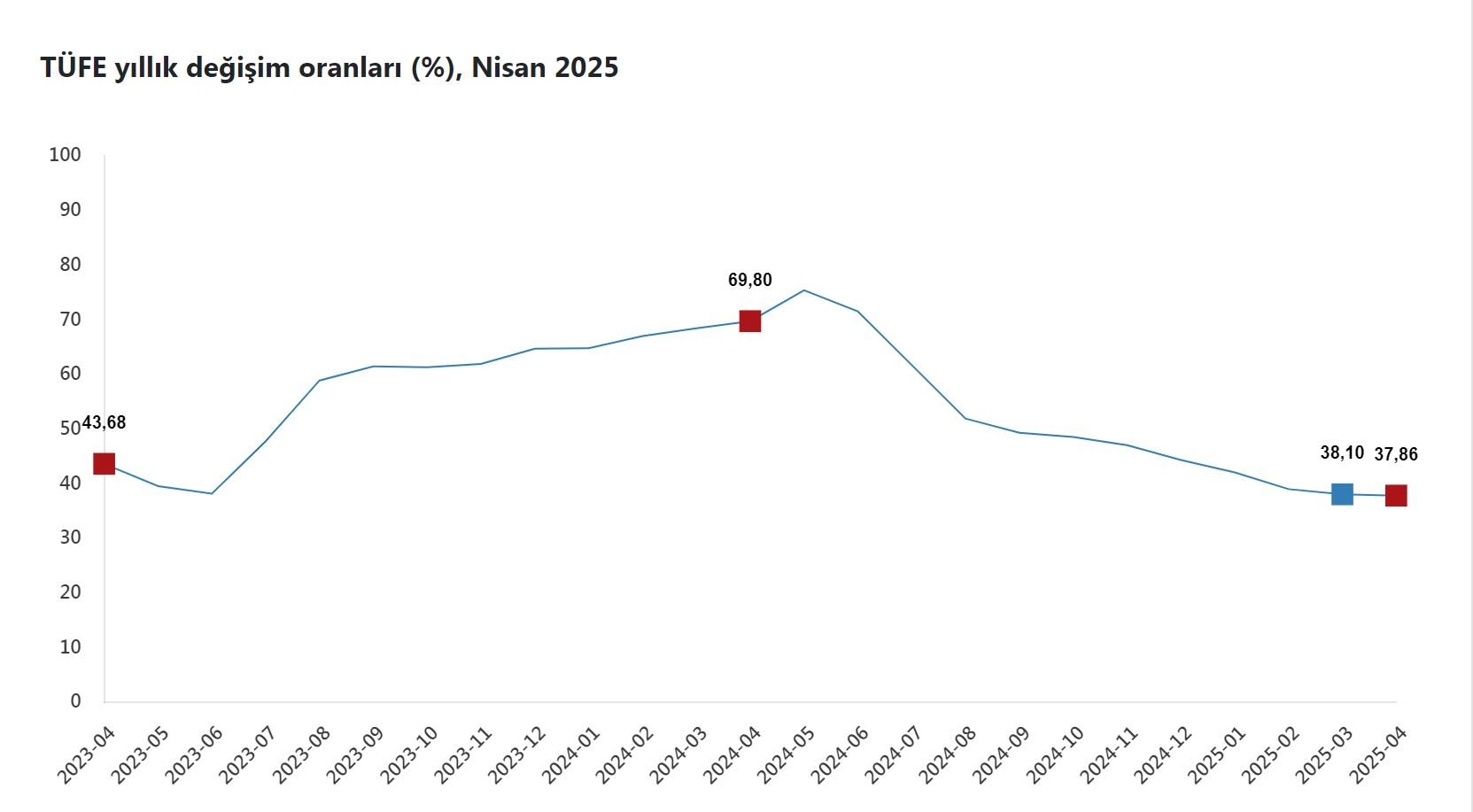 ANKARA, (DHA)- TÜRKİYE İstatistik Kurumu (TÜİK), nisan ayında tüketici enflasyonunun aylık yüzde 3, yıllık yüzde 37,86 olduğunu açıkladı.TÜİK, Nisan 2025 dönemine ilişkin enflasyon verilerini açıkladı. Buna göre; tüketici fiyatları bir önceki aya göre yüzde 3, bir önceki yılın aralık ayına göre yüzde 13,36, bir önceki yılın aynı ayına göre yüzde 37,86 ve 12 aylık ortalamalara göre yüzde 48,73 arttı.Tüketici enflasyonunda en yüksek ağırlığa sahip 3 ana harcama grubunun yıllık değişimleri; gıda ve alkolsüz içeceklerde yüzde 36,09 artış, ulaştırmada yüzde 22,76 artış ve konutta yüzde 74,07 artış olarak gerçekleşti. İlgili ana grupların yıllık değişime olan etkileri ise gıda ve alkolsüz içeceklerde yüzde 9,21, ulaştırmada yüzde 3,84 ve konutta yüzde 9,98 oldu.GIDA VE ALKOLSÜZ İÇECEKLERDE AYLIK YÜZDE 2,01 ARTIŞEn yüksek ağırlığa sahip 3 ana harcama grubunun aylık değişimleri; gıda ve alkolsüz içeceklerde yüzde 2,01 artış, ulaştırmada yüzde 3,80 artış ve konutta yüzde 4,66 artış olarak gerçekleşti. İlgili ana grupların aylık değişime olan etkileri ise gıda ve alkolsüz içeceklerde yüzde 0,51, ulaştırmada yüzde 0,57 ve konutta yüzde 0,74 oldu.Endekste kapsanan 143 temel başlıktan (Amaca Göre Bireysel Tüketim Sınıflaması-COICOP 5'li Düzey) 2025 yılı nisan ayı itibarıyla, 18 temel başlığın endeksinde düşüş gerçekleşirken, 4 temel başlığın endeksinde değişim olmadı. 121 temel başlığın endeksinde ise artış gerçekleşti.YILLIK ÜRETİCİ ENFLASYONU YÜZDE 22,50Yurt içi üretici fiyatları ise nisan ayında bir önceki aya göre yüzde 2,76, bir önceki yılın aralık ayına göre yüzde 10,19, bir önceki yılın aynı ayına göre yüzde 22,50 ve 12 aylık ortalamalara göre yüzde 32,65 artış gösterdi. (DHA)