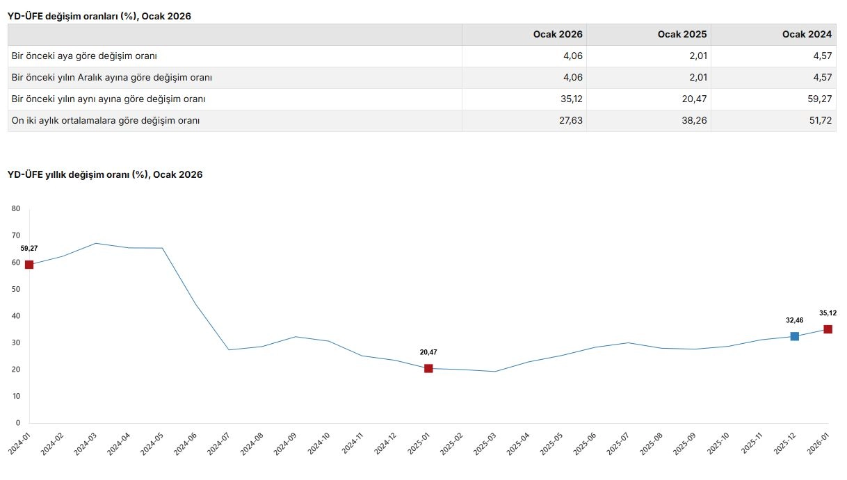 ANKARA, (DHA)- TÜRKİYE İstatistik Kurumu (TÜİK), yurt dışı üretici fiyatlarının ocak ayında yıllık yüzde 35,12; aylık yüzde 4,06 arttığını açıkladı.