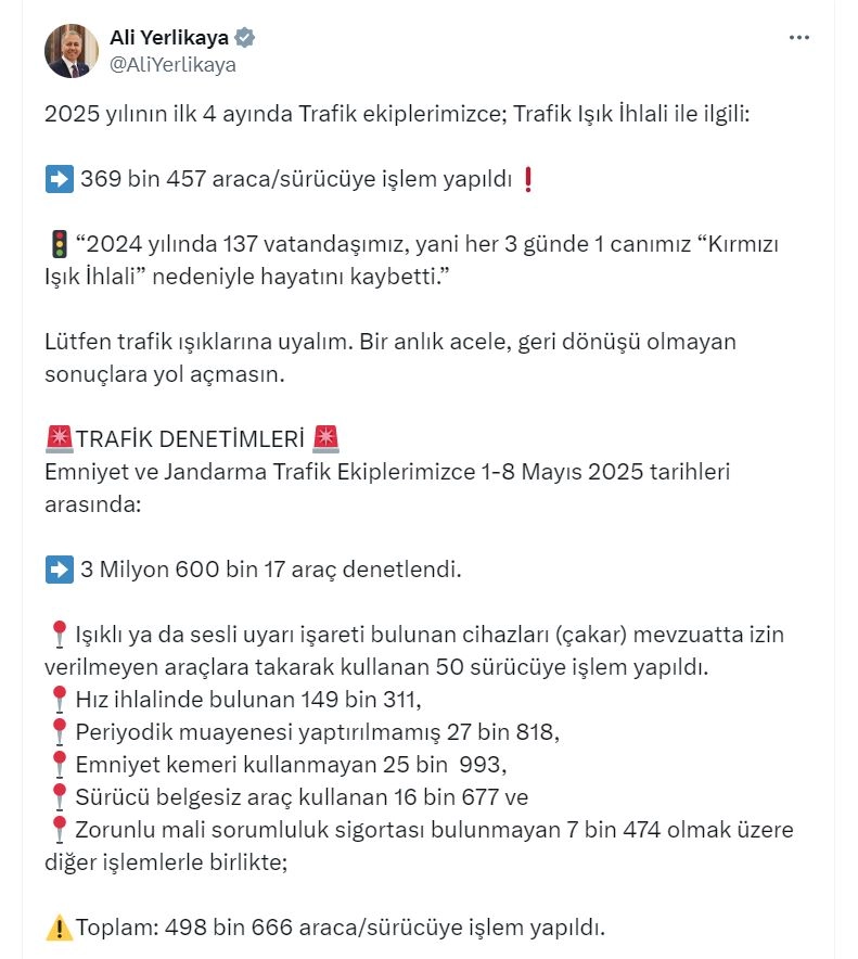 ANKARA, (DHA)- İÇİŞLERİ Bakanı Ali Yerlikaya, 2025 yılının ilk 4 ayında, trafik ışık ihlali yaptığı belirlenen 369 bin 457 sürücüye işlem yapıldığını duyurdu.Bakan Yerlikaya, sosyal medya hesabından yaptığı açıklamada, "2025 yılının ilk 4 ayında trafik ekiplerimizce; trafik ışık ihlali ile ilgili 369 bin 457 araca/sürücüye işlem yapıldı. 2024 yılında 137 vatandaşımız, yani her 3 günde 1 canımız 'kırmızı ışık ihlali' nedeniyle hayatını kaybetti. Lütfen trafik ışıklarına uyalım. Bir anlık acele, geri dönüşü olmayan sonuçlara yol açmasın" dedi.TRAFİK DENETİMLERİPaylaşımında ayrıca trafik denetim verilerine yer veren Bakan Yerlikaya, "Emniyet ve jandarma trafik ekiplerimizce 1-8 Mayıs 2025 tarihleri arasında 3 milyon 600 bin 17 araç denetlendi. Işıklı ya da sesli uyarı işareti bulunan cihazları (çakar) mevzuatta izin verilmeyen araçlara takarak kullanan 50 sürücüye işlem yapıldı. Hız ihlalinde bulunan 149 bin 311, periyodik muayenesi yaptırılmamış 27 bin 818, emniyet kemeri kullanmayan 25 bin 993, sürücü belgesiz araç kullanan 16 bin 677 ve zorunlu mali sorumluluk sigortası bulunmayan 7 bin 474 olmak üzere diğer işlemlerle birlikte toplam 498 bin 666 araca/sürücüye işlem yapıldı. Yolculuklar sizleri sevdiklerinize kavuşturmak için vardır, ayırmak için değil" ifadelerini kullandı. (DHA)