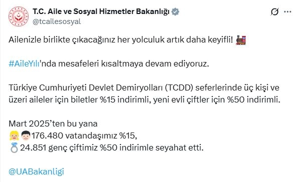 Bakanlığın sosyal medya hesabından yapılan açıklamada, "Ailenizle birlikte çıkacağınız her yolculuk artık daha keyifli. 'Aile Yılı'nda mesafeleri kısaltmaya devam ediyoruz. Türkiye Cumhuriyeti Devlet Demiryolları (TCDD) seferlerinde üç kişi ve üzeri aileler için biletler yüzde 15 indirimli, yeni evli çiftler için yüzde 50 indirimli. Mart 2025'ten bu yana 176 bin 480 vatandaşımız yüzde 15, 24 bin 851 genç çiftimiz yüzde 50 indirimle seyahat etti" denildi. (DHA)
