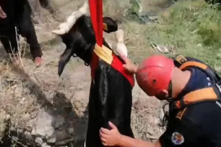 Adana’nın Kozan ilçesi Kemer Mahallesi'nde sahibi tarafından kesime götürülen boğa kaçtı. Araziye doğru koşan boğayı yakalamak için sahibi ve aile fertleri uzun süre uğraştı ancak başarılı olamadı. Bir süre daha kaçan boğa kuyuya düştü. Sahibinin ihbarı üzerine bölgeye itfaiye ekipleri sevk edildi. Halat yardımıyla kuyuya inen itfaiye görevlisi, boğayı kurtararak sahibine teslim etti. (DHA)