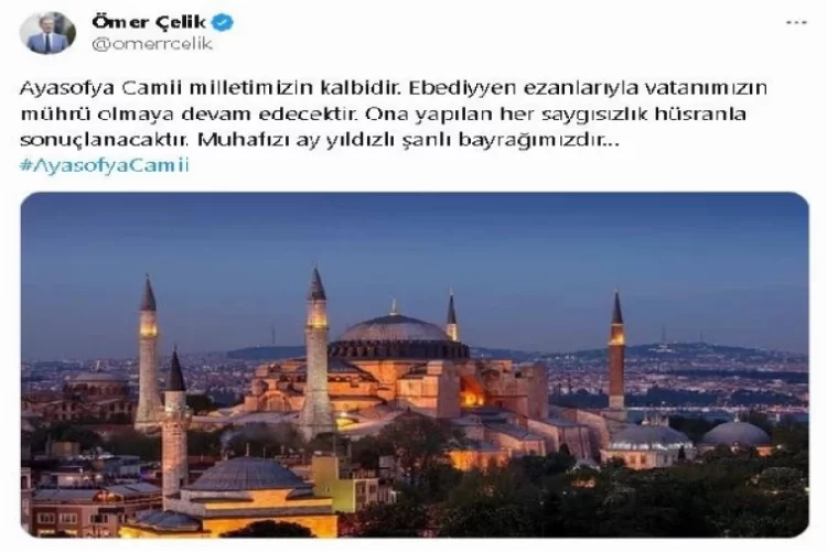 ANKARA, (DHA)- AK Parti Genel Başkan Yardımcısı ve Parti Sözcüsü Ömer Çelik, "Ayasofya Camii milletimizin kalbidir. Ona yapılan her saygısızlık hüsranla sonuçlanacaktır" dedi. İstanbul'da Sultanahmet Meydanı'nda elinde Yunanistan bayrağı bulunan bir kişinin, Ayasofya Camii'ni arkasına alarak provokatif açıklamalar içeren video paylaşmasına AK Parti Sözcüsü Ömer Çelik tepki gösterdi. Çelik, Twitter hesabından yaptığı paylaşımda, "Ayasofya Camii milletimizin kalbidir. Ebediyyen ezanlarıyla vatanımızın mührü olmaya devam edecektir. Ona yapılan her saygısızlık hüsranla sonuçlanacaktır. Muhafızı ay yıldızlı şanlı bayrağımızdır" ifadelerini kullandı. (DHA)