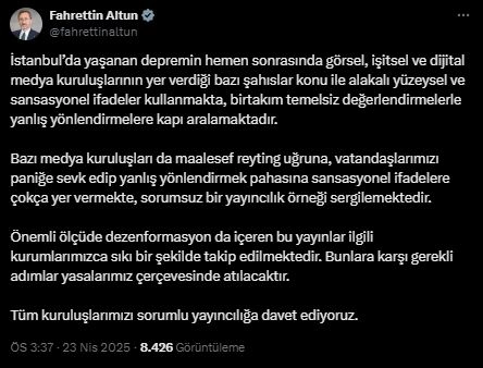 ANKARA, (DHA)- İLETİŞİM Başkanı Fahrettin Altun, İstanbul açıklarında meydana gelen depremle ilgili yapılan yayınlara ilişkin, "Bazı medya kuruluşları maalesef reyting uğruna, vatandaşlarımızı paniğe sevk edip yanlış yönlendirmek pahasına sansasyonel ifadelere çokça yer vermekte, sorumsuz bir yayıncılık örneği sergilemektedir. Önemli ölçüde dezenformasyon da içeren bu yayınlar, ilgili kurumlarımızca sıkı bir şekilde takip edilmektedir" dedi.İletişim Başkanı Altun, Marmara Denizi'nde, Silivri açıklarında meydana gelen 6.2 büyüklüğündeki depremlere ilişkin sosyal medya hesabından açıklama yaptı. Altun, "İstanbul'da yaşanan depremin hemen sonrasında görsel, işitsel ve dijital medya kuruluşlarının yer verdiği bazı şahıslar konu ile alakalı yüzeysel ve sansasyonel ifadeler kullanmakta, birtakım temelsiz değerlendirmelerle yanlış yönlendirmelere kapı aralamaktadır. Bazı medya kuruluşları da maalesef reyting uğruna, vatandaşlarımızı paniğe sevk edip yanlış yönlendirmek pahasına sansasyonel ifadelere çokça yer vermekte, sorumsuz bir yayıncılık örneği sergilemektedir. Önemli ölçüde dezenformasyon da içeren bu yayınlar ilgili kurumlarımızca sıkı bir şekilde takip edilmektedir. Bunlara karşı gerekli adımlar yasalarımız çerçevesinde atılacaktır. Tüm kuruluşlarımızı sorumlu yayıncılığa davet ediyoruz" açıklamalarında bulundu. (DHA)
