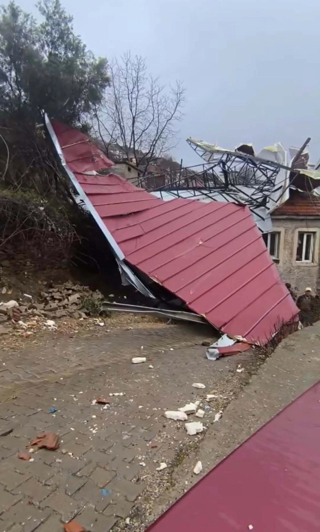Fırtına nedeniyle inşaat halindeki evin duvarlarında da hasar oluştu. İhbarla bölgeye ekipler sevk edildi. Ekipler, hasar tespit çalışması başlattı. (DHA)