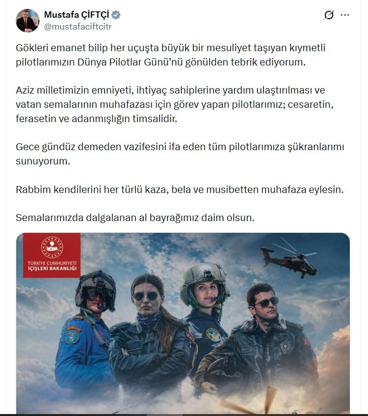 ANKARA, (DHA)- İÇİŞLERİ Bakanı Mustafa Çiftçi, sanal medya hesabından yaptığı paylaşımla 'Dünya Pilotlar Günü'nü kutladı.