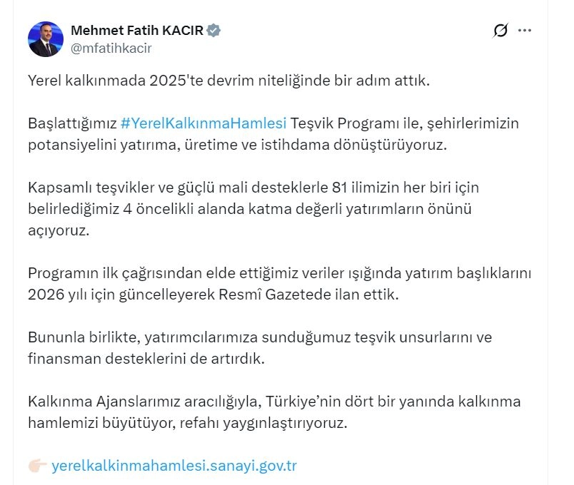 Bakan Mehmet Fatih Kacır, sanal medya hesabından yaptığı açıklamada, "Yerel kalkınmada 2025'te devrim niteliğinde bir adım attık. Başlattığımız Yerel Kalkınma Hamlesi Teşvik Programı ile şehirlerimizin potansiyelini yatırıma, üretime ve istihdama dönüştürüyoruz. Kapsamlı teşvikler ve güçlü mali desteklerle 81 ilimizin her biri için belirlediğimiz 4 öncelikli alanda katma değerli yatırımların önünü açıyoruz. Programın ilk çağrısından elde ettiğimiz veriler ışığında yatırım başlıklarını 2026 yılı için güncelleyerek Resmi Gazete'de ilan ettik. Bununla birlikte, yatırımcılarımıza sunduğumuz teşvik unsurlarını ve finansman desteklerini de artırdık. Kalkınma Ajanslarımız aracılığıyla, Türkiye'nin dört bir yanında kalkınma hamlemizi büyütüyor, refahı yaygınlaştırıyoruz" ifadelerini kullandı. (DHA)