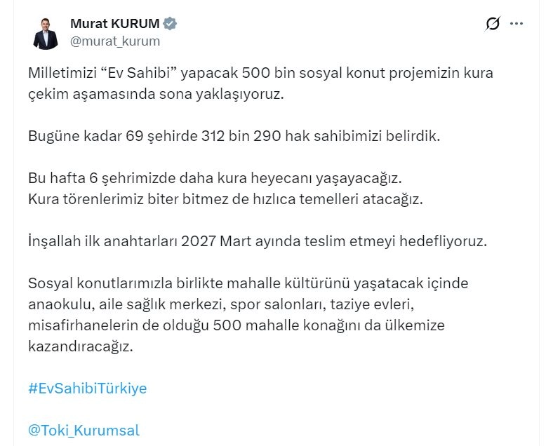 Sanal medya hesabından 23 Şubat-1 Mart haftasının kura takvimini paylaşan Bakan Kurum, "Milletimizi 'Ev Sahibi' yapacak 500 bin sosyal konut projemizin kura çekim aşamasında sona yaklaşıyoruz. Bugüne kadar 69 şehirde 312 bin 290 hak sahibimizi belirdik. Bu hafta 6 şehrimizde daha kura heyecanı yaşayacağız. Kura törenlerimiz biter bitmez de hızlıca temelleri atacağız. İnşallah ilk anahtarları 2027 Mart ayında teslim etmeyi hedefliyoruz. Sosyal konutlarımızla birlikte mahalle kültürünü yaşatacak içinde anaokulu, aile sağlık merkezi, spor salonları, taziye evleri, misafirhanelerin de olduğu 500 mahalle konağını da ülkemize kazandıracağız" dedi.