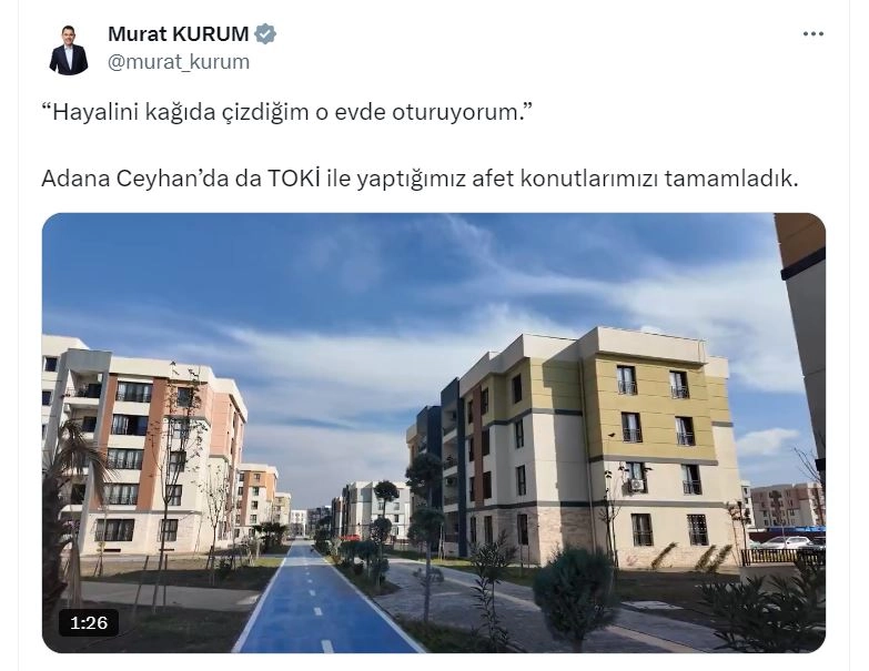 ANKARA, (DHA)- ÇEVRE, Şehircilik ve İklim Değişikliği Bakanı Murat Kurum, sosyal medya hesabından yaptığı paylaşımda, Ceyhanlı depremzede Ceylan Gök'ün 'Hayalini kağıda çizdiğim o evde oturuyorum' sözlerini alıntılayarak, "Adana Ceyhan'da da TOKİ ile yaptığımız afet konutlarımızı tamamladık" dedi.Bakanlıktan yapılan açıklamaya göre; Çevre, Şehircilik ve İklim Değişikliği Bakanlığı, 6 Şubat depremlerinden zarar gören Adana'da da inşa ve ihya çalışmalarını aralıksız sürdürüyor. TOKİ, Ceyhan ilçesindeki Mithatpaşa Mahallesi'nde 3 etap olarak başlattığı 1357 afet konutunun tamamının inşasını bitirdi. Mithatpaşa Mahallesi'ndeki yeni evlerine yerleşen vatandaşların görüntülerini sosyal medya hesabından paylaşan Çevre, Şehircilik ve İklim Değişikliği Bakanı Murat Kurum, hak sahibi Ceylan Gök'ün 'Hayalini kağıda çizdiğim o evde oturuyorum' sözlerini alıntılayarak, "Adana Ceyhan'da da TOKİ ile yaptığımız afet konutlarımızı tamamladık" ifadelerini kullandı.'DEPREMİN SENESİ DOLMADAN ANAHTARI ALDIM'Görüntülerde yer alan depremzede Ceylan Gök, hayal ettiği eve kavuşma hikayesini şöyle anlattı: "Benim yıllar önce yazdığım bir kağıt var, hala bende durur. O kağıda, '3 1, kileri olan bir ev' yazıyorum, 'güney cepheli olsun' diyorum. Şu anda o evde oturuyorum şükürler olsun. Normal şartlarda imkansız bir şeyi başardılar. Depremin senesi dolmadan evin anahtarını aldım. Burası tamamen hayal ettiğim gibi." (DHA)