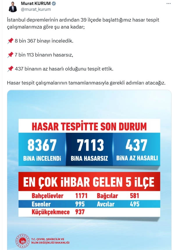 ANKARA, (DHA)-ÇEVRE, Şehircilik ve İklim Değişikliği Bakanı Murat Kurum, İstanbul'da 8 bin 367 binanın incelendiğini, bunlardan 437'sinin az hasarlı olduğunu duyurdu. Bakan Kurum, sosyal medya hesabından yaptığı açıklamada, "İstanbul depremlerinin ardından 39 ilçede başlattığımız hasar tespit çalışmalarımıza göre şu ana kadar; 8 bin 367 binayı inceledik. 7 bin 113 binanın hasarsız, 437 binanın az hasarlı olduğunu tespit ettik. Hasar tespit çalışmalarının tamamlanmasıyla gerekli adımları atacağız" dedi. (DHA)