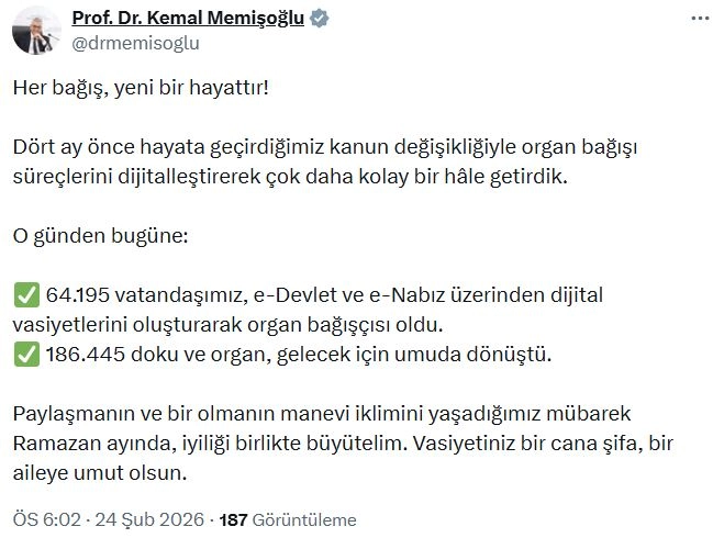 Sağlık Bakanı Kemal Memişoğlu sanal medya hesabından yaptığı açıklamada, "Her bağış, yeni bir hayattır. Dört ay önce hayata geçirdiğimiz kanun değişikliğiyle organ bağışı süreçlerini dijitalleştirerek çok daha kolay bir hale getirdik. O günden bugüne; 64 bin 195 vatandaşımız, e-Devlet ve e-Nabız üzerinden dijital vasiyetlerini oluşturarak organ bağışçısı oldu. 186 bin 445 doku ve organ, gelecek için umuda dönüştü. Paylaşmanın ve bir olmanın manevi iklimini yaşadığımız mübarek Ramazan ayında, iyiliği birlikte büyütelim. Vasiyetiniz bir cana şifa, bir aileye umut olsun" ifadelerine yer verdi. (DHA)