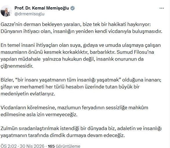 Bakan Memişoğlu, sanal medya hesabından yaptığı açıklamada, "Gazze’nin derman bekleyen yaraları, bize tek bir hakikati haykırıyor: Dünyanın ihtiyacı olan, insanlığın yeniden kendi vicdanıyla buluşmasıdır. En temel insani ihtiyaçları olan suya, gıdaya ve umuda ulaşmaya çalışan masumların önünü kesmek korkaklıktır, barbarlıktır. Sumud Filosu’na yapılan müdahale yalnızca hukukun değil, insanlık onurunun da çiğnenmesidir. Bizler, 'bir insanı yaşatmanın tüm insanlığı yaşatmak' olduğuna inanan, şifayı ve merhameti her türlü hesabın üzerinde tutan büyük bir medeniyetin evlatlarıyız. Vicdanların körelmesine, mazlumun feryadının sessizliğe mahkum edilmesine asla izin vermeyeceğiz. Zulmün sıradanlaştırılmak istendiği bir dünyada biz, adaletin ve insanlığı yaşatmanın tarafında dimdik durmaya devam edeceğiz" ifadelerini kullandı. (DHA)