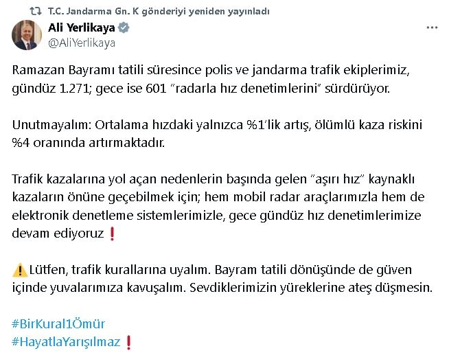 ANKARA, (DHA)- İÇİŞLERİ Bakanı Ali Yerlikaya, Ramazan Bayramı nedeniyle alınan trafik tedbirlerinin sürdüğünü belirterek, sürücülere aşırı hız uyarısında bulundu. İçişleri Bakanı Ali Yerlikaya, sosyal medya hesabından yaptığı açıklamada, "Ramazan Bayramı tatili süresince polis ve jandarma trafik ekiplerimiz, gündüz 1271, gece ise 601 radarla hız denetimlerini sürdürüyor. Unutmayalım; ortalama hızdaki yalnızca yüzde 1'lik artış, ölümlü kaza riskini yüzde 4 oranında artırmaktadır. Trafik kazalarına yol açan nedenlerin başında gelen aşırı hız kaynaklı kazaların önüne geçebilmek için; hem mobil radar araçlarımızla hem de elektronik denetleme sistemlerimizle, gece gündüz hız denetimlerimize devam ediyoruz. Lütfen, trafik kurallarına uyalım. Bayram tatili dönüşünde de güven içinde yuvalarımıza kavuşalım. Sevdiklerimizin yüreklerine ateş düşmesin" ifadelerini kullandı. (DHA)