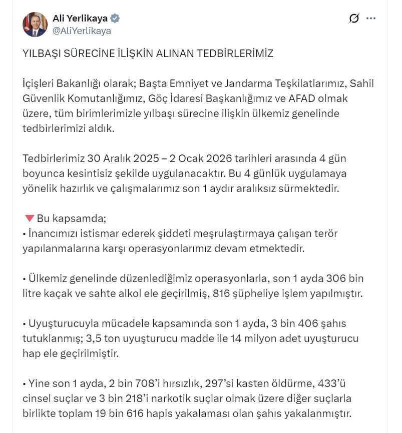 Bakan Yerlikaya, sanal medya hesabından yaptığı açıklamada, İçişleri Bakanlığı olarak; başta Emniyet Genel Müdürlüğü, Jandarma Genel Komutanlığı, Sahil Güvenlik Komutanlığı, Göç İdaresi Başkanlığı ve AFAD olmak üzere, ülke genelinde tüm birimlerle yılbaşı sürecine ilişkin tedbirler alındığını bildirdi.