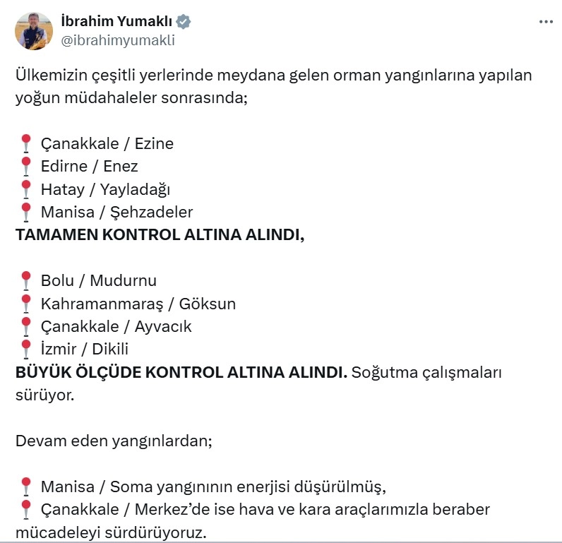 ANKARA, (DHA)- TARIM ve Orman Bakanı İbrahim Yumaklı, ülke genelinde devam eden orman yangınlarına ilişkin 4 yangının tamamen, 4 yangının da büyük ölçüde kontrol altına alındığını duyurdu.Bakan Yumaklı, sosyal medya hesabından yaptığı açıklamada, "Ülkemizin çeşitli yerlerinde meydana gelen orman yangınlarına yapılan yoğun müdahaleler sonrasında; Çanakkale Ezine, Edirne Enez, Hatay Yayladağı, Manisa Şehzadeler tamamen kontrol altına alındı. Bolu Mudurnu, Kahramanmaraş Göksun, Çanakkale Ayvacık, İzmir Dikili büyük ölçüde kontrol altına alındı. Soğutma çalışmaları sürüyor. Devam eden yangınlardan; Manisa Soma yangınının enerjisi düşürülmüş, Çanakkale Merkez’de ise hava ve kara araçlarımızla beraber mücadeleyi sürdürüyoruz. Yeşil vatanımızı korumak için mücadelemiz durmadan, yorulmadan devam edecek" dedi. (DHA)