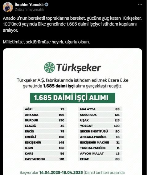 ANKARA, (DHA)- TARIM ve Orman Bakanı İbrahim Yumaklı, "Türkşeker, 100'üncü yaşında ülke genelinde 1685 daimi işçiye istihdam kapılarını aralıyor" dedi. Bakan Yumaklı, sosyal medya hesabından yaptığı açıklamada, "Anadolu'nun bereketli topraklarına bereket, gücüne güç katan Türkşeker, 100'üncü yaşında ülke genelinde 1685 daimi işçiye istihdam kapılarını aralıyor. Milletimize, sektörümüze hayırlı, uğurlu olsun" ifadelerini kullandı. Başvuruların 14-17 Nisan 2025 tarihleri arasında Türkiye İş Kurumu (İŞKUR) üzerinden gerçekleşeceği belirtildi. (DHA)