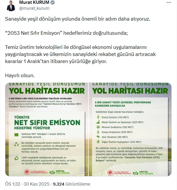 Konuyla ilgili sosyal medya hesabından açıklama yapan Çevre, Şehircilik ve İklim Değişikliği Bakanı Murat Kurum, "Sanayide yeşil dönüşüm yolunda önemli bir adım daha atıyoruz. '2053 Net Sıfır Emisyon' hedeflerimiz doğrultusunda; temiz üretim teknolojileri ile döngüsel ekonomi uygulamalarını yaygınlaştıracak ve ülkemizin sanayideki rekabet gücünü artıracak kararlar 1 Aralık'tan itibaren yürürlüğe giriyor. Hayırlı olsun" ifadelerini kullandı. (DHA)