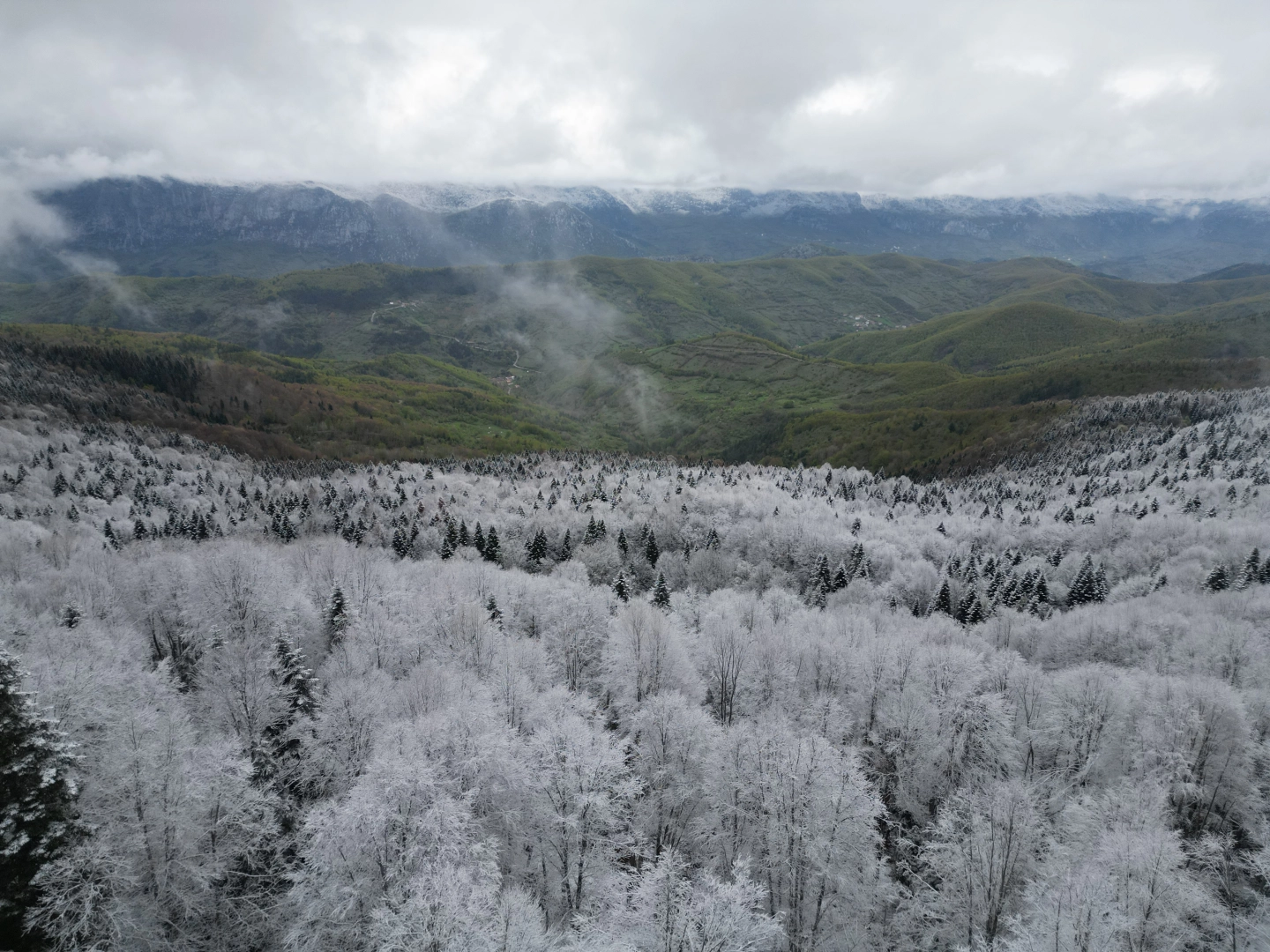 Ayhan ACAR/ULUS (Bartın), (DHA)- BARTIN-Kastamonu kara yolunun Soğucaksu Geçidi'nde nisan ayında kar yağışı etkili oldu. 1030 rakımlı zirvede kar kalınlığı 5 santimetreye ulaşırken, ilkbaharda yemyeşil doğayla beyaz örtü bütünleşti. Oluşan manzara dronla görüntülendi.Bartın'ın Ulus ilçesi ile Kastamonu Pınarbaşı ilçesini birbirine bağlayan kara yolunun 1030 rakımlı Soğucaksu Geçidi'ne nisan ayında önceki gece kar yağdı. Bölgede kar kalınlığı 5 santime ulaştı. Zirvede yeşil ağaçların üzerine yağan kar, güzel bir manzara oluşturdu. Ayrıca 1200 rakımdaki Isırganlı ve Elmacık köylerine yağan kar nedeniyle çiçek açan ağaçlar da beyaz örtüyle kaplandı. Köydeki eski tarihi evlerin karlı görüntüsü görenleri hayran bıraktı. Hasanören, Göksu, Şirinler ve Isırganlı köyleri ile karla kaplanan bölge dronla görüntülendi. (DHA)