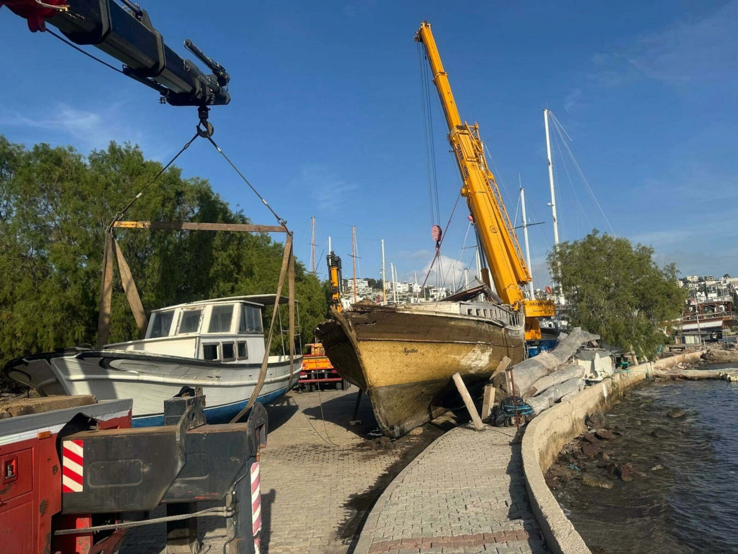 Fırat AKAY/BODRUM (Muğla), (DHA)- MUĞLA’nın Bodrum ilçesinde, yaklaşık 2 yıldır yarı batık halde bulunan tekne, vinç yardımıyla sudan çıkarıldı.Bodrum Bölge Liman Başkanlığı, Yalıkavak sahili tersaneler bölgesinde yaklaşık 2 yıldır yarı batık halde bulunan 17 metre uzunluğundaki 'Suntan' isimli teknenin kaldırılması için harekete geçti. Tekne, ekiplerce vinç yardımıyla sudan çıkarıldı. Bodrum Bölge Liman Başkanlığı’nın denizdeki can ve mal güvenliğini tehlikeye düşüren batık durumdaki diğer teknelerin de sudan çıkarılması için çalışmalarını sürdürdüğü bildirildi. (DHA)