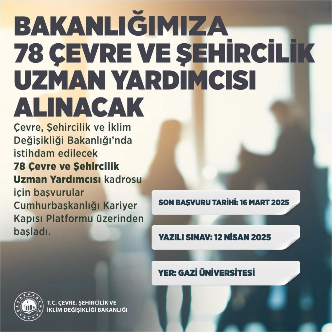 Gizem CENGİL/ANKARA, (DHA)- ÇEVRE, Şehircilik ve İklim Değişikliği Bakanlığı, 78 çevre ve şehircilik uzman yardımcısı alımına ilişkin başvuruların başladığını açıkladı. Bakanlıktan yapılan açıklamaya göre; Çevre, Şehircilik ve İklim Değişikliği Bakanlığı'nda istihdam edilmek üzere 78 çevre ve şehircilik uzman yardımcısı alınacak. Cumhurbaşkanlığı Kariyer Kapısı Platformu üzerinden başlayan başvurular 16 Mart'ta sona erecek. 'Çevre ve Şehircilik Uzmanlığı Yönetmeliği' hükümleri çerçevesinde yazılı ve sözlü sınav yapılacak. Yazılı sınav, 12 Nisan'da Gazi Üniversitesi'nde yapılacak. Adaylar başvuru koşullarına ve diğer detaylara 'https://isealimkariyerkapisi.cbiko.gov.tr/' adresinden ulaşabilecek. (DHA)