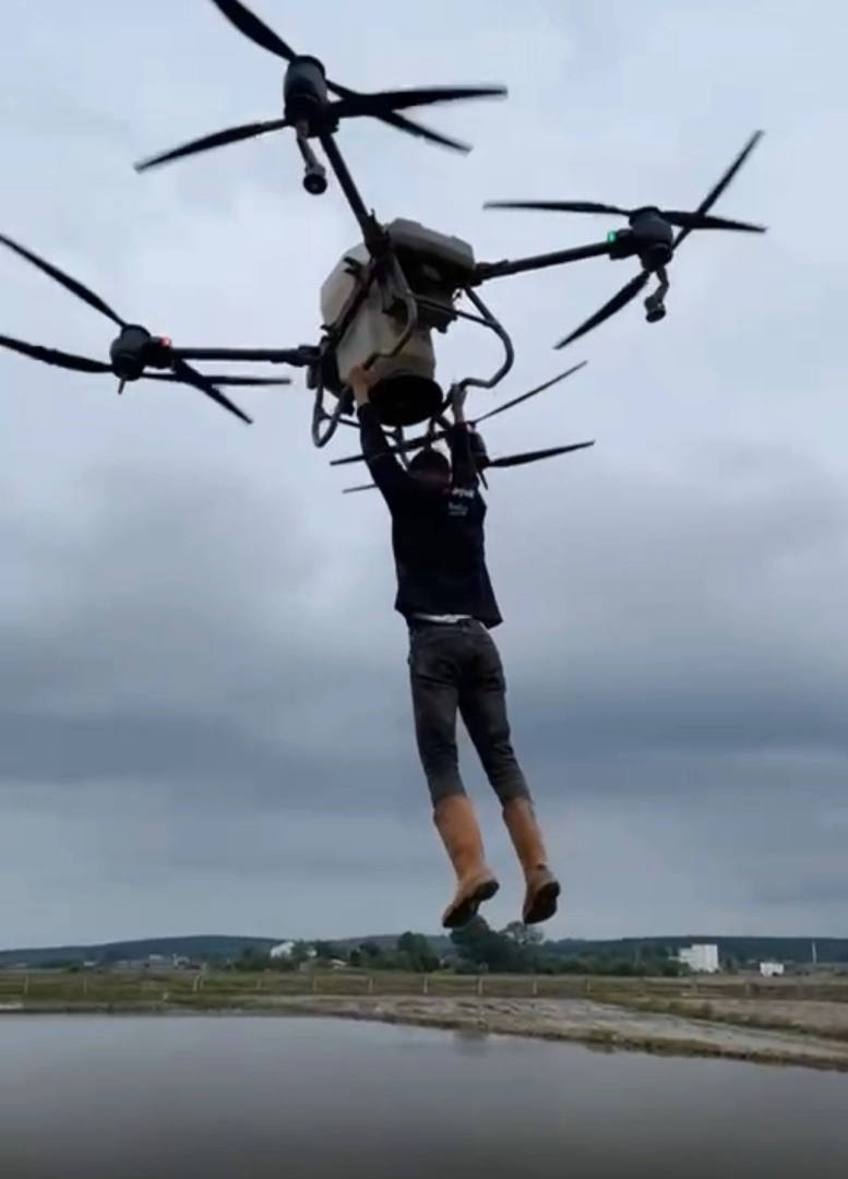 Bafra ilçesi Kelikler Mahallesi’nde çeltik tarlasını ilaçlayan bir çiftçi, tarlanın diğer ucuna geçmek için kullandığı drona tutundu. İlaçlama yaptığı drona asılan çiftçi, kısa süreli havalanarak tarlanın karşı tarafına geçti. Çevredeki bir kişi tarafından cep telefonu kamerasıyla kaydedilen görüntüler, sanal medyada paylaşıldı. (DHA)