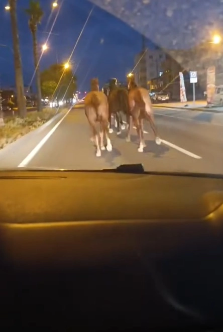 Okan ÇALIŞKAN/MERSİN, (DHA)- MERSİN'de bir çiftlikten kaçan yarış atları, D-400 kara yolunda görüntülendi.Akdeniz ilçesi Huzurkent Mahallesi'nde iş insanı Mehmet Emin Karamehmet'in ailesine ait çiftlikten kaçan 20 yarış atı, D-400 kara yolunda Adana yönünde dört nala koştu. Araçların arasından da geçen atlar, çevredekiler tarafından cep telefonu kamerasıyla görüntülendi. Bazı atlar vatandaşlar tarafından yakalanırken, bazıları da başka bölgelere dağılarak izlerini kaybettirdi. (DHA)