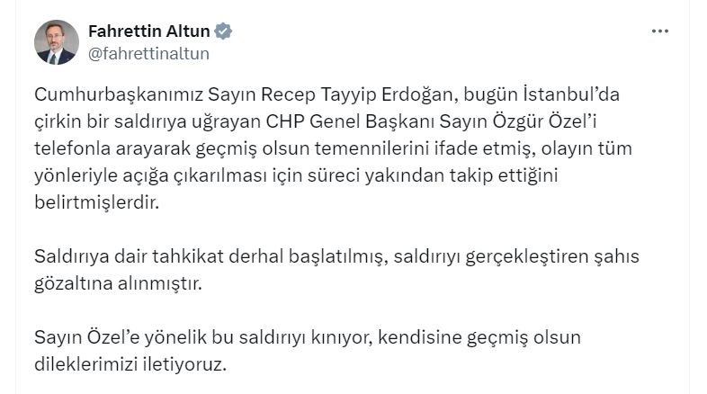 ANKARA, (DHA)- CUMHURBAŞKANI Recep Tayyip Erdoğan, bugün İstanbul'da saldırıya uğrayan CHP Genel Başkanı Özgür Özel'i telefonla arayarak 'geçmiş olsun' dileklerini iletti.İletişim Başkanı Fahrettin Altun, görüşmeye ilişkin sosyal medya hesabından açıklama yaptı. Altun, "Cumhurbaşkanımız Sayın Recep Tayyip Erdoğan, bugün İstanbul'da çirkin bir saldırıya uğrayan CHP Genel Başkanı Sayın Özgür Özel'i telefonla arayarak geçmiş olsun temennilerini ifade etmiş, olayın tüm yönleriyle açığa çıkarılması için süreci yakından takip ettiğini belirtmişlerdir. Saldırıya dair tahkikat derhal başlatılmış, saldırıyı gerçekleştiren şahıs gözaltına alınmıştır. Sayın Özel'e yönelik bu saldırıyı kınıyor, kendisine geçmiş olsun dileklerimizi iletiyoruz" ifadelerini kullandı. (DHA)