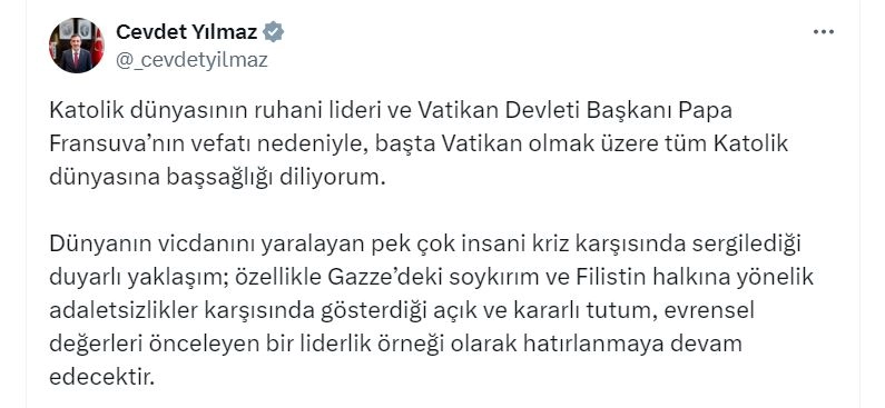 ANKARA, (DHA)- CUMHURBAŞKANI Yardımcısı Cevdet Yılmaz, hayatını kaybeden Vatikan Devlet Başkanı Papa Fransuva için taziye mesajı yayımladı.Cevdet Yılmaz, "Katolik dünyasının ruhani lideri ve Vatikan Devleti Başkanı Papa Fransuva'nın vefatı nedeniyle, başta Vatikan olmak üzere tüm Katolik dünyasına başsağlığı diliyorum. Dünyanın vicdanını yaralayan pek çok insani kriz karşısında sergilediği duyarlı yaklaşım; özellikle Gazze'deki soykırım ve Filistin halkına yönelik adaletsizlikler karşısında gösterdiği açık ve kararlı tutum, evrensel değerleri önceleyen bir liderlik örneği olarak hatırlanmaya devam edecektir" ifadelerini kullandı. (DHA)