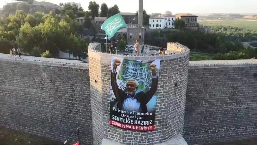 Gıyasettin TETİK / DİYARBAKIR, (DHA)- DİYARBAKIR'da bir grup, İran'da uğradığı suikast sonucu hayatını kaybeden Hamas Siyasi Büro Şefi İsmail Haniye'nin posterini tarihi surlara astı.Kentte bir grup, yeni Cumhurbaşkanı Mesud Pezeşkiyan'ın yemin törenine katılmak üzere bulunduğu İran'ın başkenti Tahran'da, tören sonrası evinde uğradığı suikast sonucu hayatını kaybeden Hamas Siyasi Büro Şefi İsmail Haniye'nin posterini, tarihi surlara astı. Posterin üzerinde, 'Filistin ve ümmetin onuru için şehitliğe hazırız' yazısının olduğu görüldü. (DHA)
