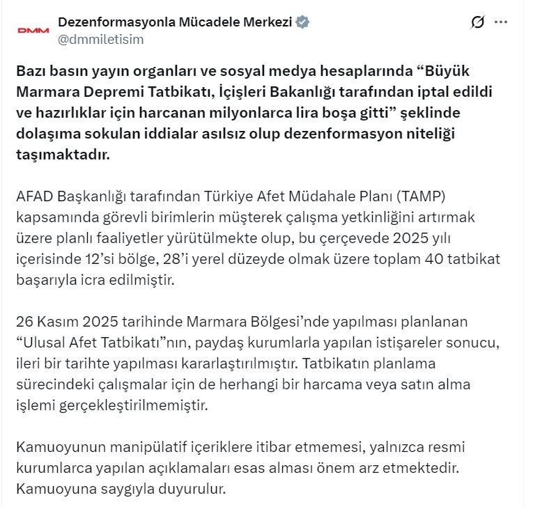 DMM'nin sosyal medya hesabından yapılan açıklamada, bazı basın yayın organları ve sosyal medya hesaplarında 'Büyük Marmara Depremi Tatbikatı, İçişleri Bakanlığı tarafından iptal edildi ve hazırlıklar için harcanan milyonlarca lira boşa gitti' şeklinde iddiaların dolaşıma sokulduğu belirtilerek, "İddialar asılsız olup dezenformasyon niteliği taşımaktadır. AFAD Başkanlığı tarafından Türkiye Afet Müdahale Planı (TAMP) kapsamında görevli birimlerin müşterek çalışma yetkinliğini artırmak üzere planlı faaliyetler yürütülmekte olup, bu çerçevede 2025 yılı içerisinde 12’si bölge, 28’i yerel düzeyde olmak üzere toplam 40 tatbikat başarıyla icra edilmiştir. 26 Kasım 2025 tarihinde Marmara Bölgesi’nde yapılması planlanan 'Ulusal Afet Tatbikatı'nın, paydaş kurumlarla yapılan istişareler sonucu, ileri bir tarihte yapılması kararlaştırılmıştır. Tatbikatın planlama sürecindeki çalışmalar için de herhangi bir harcama veya satın alma işlemi gerçekleştirilmemiştir. Kamuoyunun manipülatif içeriklere itibar etmemesi, yalnızca resmi kurumlarca yapılan açıklamaları esas alması önem arz etmektedir" denildi. (DHA)