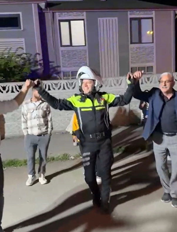 Tezcan SOLMAZ/ DÜZCE, (DHA)- DÜZCE’de bir düğün merasimi sırasında düğüne katılan misafirler araçlarını ana yolu kapatacak şekilde park etti. Yoldan geçemeyen vatandaşların ihbarı üzerine olay yerine giden trafik polisi yolun açılmasını sağladıktan sonra düğün sahiplerinin ısrarı üzerine halay çekti. Akşam saatlerinde Ağa Mahallesi’nde düzenlenen düğün merasiminde, bazı davetliler araçlarını ana yolu kapatacak şekilde park etti. İhbar üzerine olay yerine giden Düzce İl Emniyet Müdürlüğü’ne bağlı Trafik Şubesi ekipleri, düğün esnasında yolu kapatan araçların plakalarını anons ederek araç sahiplerini araçlarını kaldırmaları yönünde uyardı. Yolun açılmasının ardından düğün sahipleri polis memurunu halaya davet etti. Düğün sahiplerinin ısrarı üzerine halaya katılan trafik polisi başında kaskı ile çalan müzik eşliğinde eğlendi. (DHA)