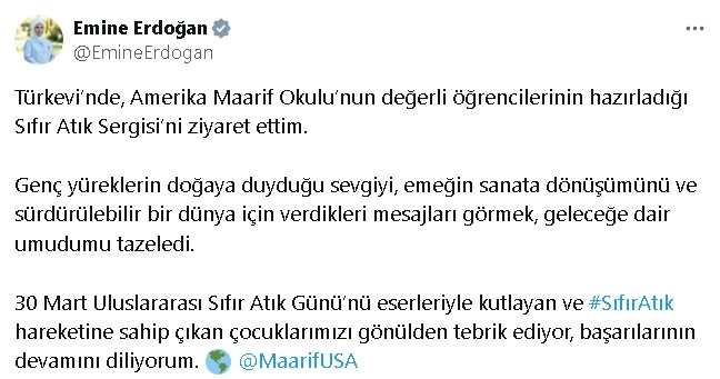 ANKARA, (DHA)- CUMHURBAŞKANI Recep Tayyip Erdoğan'ın eşi Emine Erdoğan, Birleşmiş Milletler'in (BM) 27 Mart'ta gerçekleşecek '30 Mart Uluslararası Sıfır Atık Günü Özel Etkinliği'nde konuşma yapmak üzere geldiği New York'ta Amerika Maarif Okulu öğrencilerinin hazırladığı Sıfır Atık Sergisi'ni ziyaretine ilişkin paylaşımda bulundu.Emine Erdoğan, sosyal medya hesabından yaptığı paylaşımda, şu ifadeleri kullandı:"Türkevi'nde, Amerika Maarif Okulu'nun değerli öğrencilerinin hazırladığı Sıfır Atık Sergisi'ni ziyaret ettim. Genç yüreklerin doğaya duyduğu sevgiyi, emeğin sanata dönüşümünü ve sürdürülebilir bir dünya için verdikleri mesajları görmek, geleceğe dair umudumu tazeledi. 30 Mart Uluslararası Sıfır Atık Günü'nü eserleriyle kutlayan ve Sıfır Atık hareketine sahip çıkan çocuklarımızı gönülden tebrik ediyor, başarılarının devamını diliyorum." (DHA)