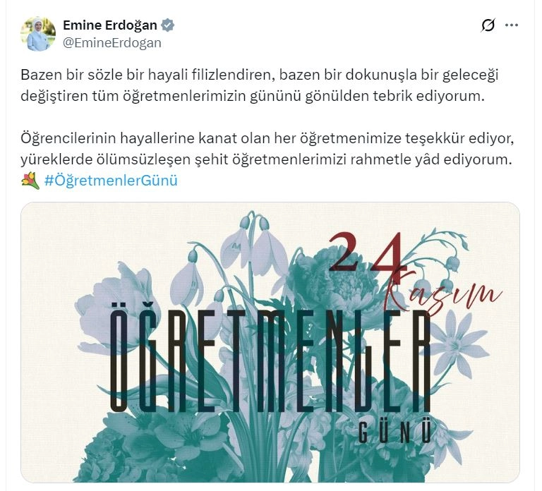 ANKARA, (DHA)- CUMHURBAŞKANI Recep Tayyip Erdoğan'ın eşi Emine Erdoğan, "Bazen bir sözle bir hayali filizlendiren, bazen bir dokunuşla bir geleceği değiştiren tüm öğretmenlerimizin gününü gönülden tebrik ediyorum" dedi.