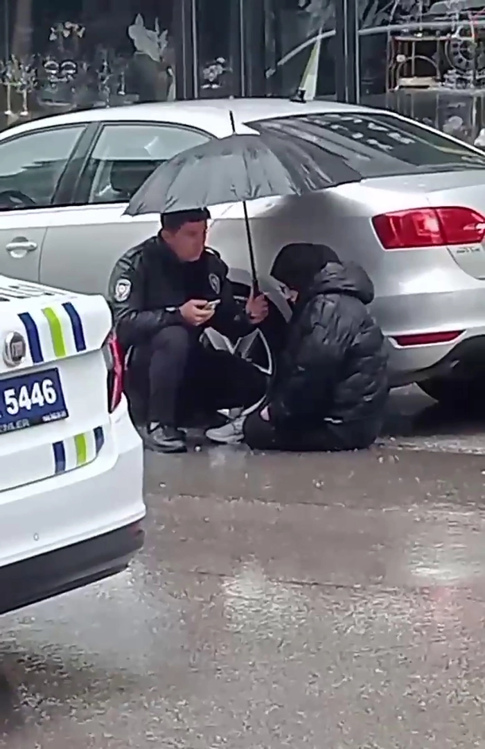 Oktay POLAT/ERZURUM,(DHA)-ERZURUM'da polis memuru Samet Arslan (31), trafik kazasında hafif yaralanan lise öğrencisi Sukeyna Örs'e (15) şemsiye tutarak yağmurdan korumaya çalıştı. O anlar cep telefonu kamerasına yansırken, 7 yıllık polis memuru Samet Arslan, "O esnada her Türk polisinin yapması gerektiği gibi biz de görevimizi yaptık" dedi. Mumcu Caddesi'nde seyreden bir araç, yolun karşısına geçmeye çalışan lise öğrencisi Sukeyna Örs'e çarptı. Öğrenci yaralanırken, kazayı gören polis memuru Samet Arslan genç kızın yanına gitti. Genç kıza durumunu sorup, ambulansı çağıran Samet Arslan, daha sonra çevreden bulduğu şemsiye ile Sukeyna Örs'ü yağmurdan korumaya çalıştı. O anlar cep telefonu kamerasına yansırken, ambulansla Erzurum Şehir Hastanesi'ne kaldırılan Sukeyna Örs tedavisi sonrası taburcu edildi. 'KIZ KARDEŞİMİN BAŞINA GEÇTİ'Erzurum Asayiş Şube Müdürlüğü Devriye Ekipler Amirliği'nde görevli, 2 çocuk babası Samet Arslan, "Mumcu Caddesi'nde rutin görevimizi ifa ederken önümüzde bir kazaya denk geldik. Küçük bir kızımıza araba çarptı. Onu gördüğümüz esnada hemen ivedi bir şekilde araçlarımızdan inerek yol güvenliğini aldık. Kız kardeşimizin başına geçtim. Durumunu sordum. Kalçasında ve kolunda ağrılar olduğunu belirtti. Diğer ekip arkadaşlarım başka bir kazaya mahal vermemek adına yol güvenliğini aldı. Ben de telsiz marifetiyle ambulans talep ettim. O esnada çevredeki vatandaşlardan şemsiye buldum. Ambulans gelene kadar kazazedenin ıslanmaması ve başka bir hastalığa mahal vermemek için 15-20 dakika boyunca kız kardeşimizin başında bekleyerek hemen babasıyla telefonda iletişim kurduk" dedi. 'TEBRİK MESAJLARI ALDIK'Samet Arslan, "Babasına kızının iyi olduğunu, herhangi bir sıkıntısı olmadığını söyledim. Sakinleştirip, serinkanlı kalmasını sağladık. O esnada her Türk polisinin yapması gerektiği gibi biz de görevimizi yaptık. Aşırı derecede yağmur yağıyordu, kardeşimize gerekli müdahaleyi kullandık. Her meslektaşım da benim yaptığımı yapardı, inanıyorum buna. Sağ olsun sıralı amirlerimiz olsun, çevredeki vatandaşlarımızdan olsun çok takdir topladık, tebrik mesajları aldık " diye konuştu. (DHA)FOTOĞRAFLI