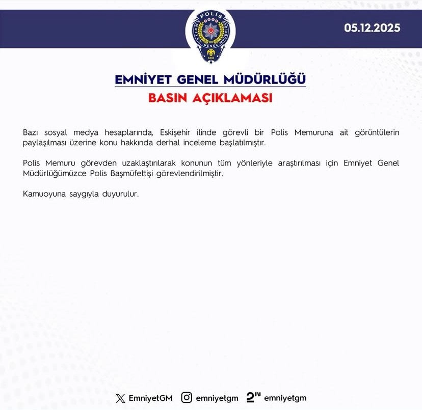 ANKARA, (DHA)- EMNİYET Genel Müdürlüğü (EGM), görüntüleri paylaşılması nedeniyle hakkında inceleme başlatılan Eskişehir'de görevli polis memurunun görevden uzaklaştırıldığını bildirdi.