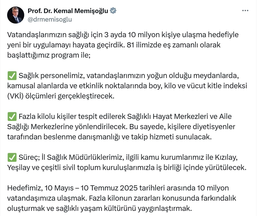 Eda KOÇ/ANKARA, (DHA)- SAĞLIK Bakanı Kemal Memişoğlu, "81 ilimizde eş zamanlı olarak başlattığımız program ile fazla kilolu kişiler tespit edilerek Sağlıklı Hayat Merkezleri ve Aile Sağlığı Merkezlerine yönlendirilecek. Bu sayede, kişilere diyetisyenler tarafından beslenme danışmanlığı ve takip hizmeti sunulacak" dedi.Bakan Memişoğlu, sosyal medya hesabından yaptığı açıklamada, "Vatandaşlarımızın sağlığı için 3 ayda 10 milyon kişiye ulaşma hedefiyle yeni bir uygulamayı hayata geçirdik. 81 ilimizde eş zamanlı olarak başlattığımız program ile sağlık personelimiz, vatandaşlarımızın yoğun olduğu meydanlarda, kamusal alanlarda ve etkinlik noktalarında boy, kilo ve vücut kitle indeksi (VKİ) ölçümleri gerçekleştirecek. Fazla kilolu kişiler tespit edilerek Sağlıklı Hayat Merkezleri ve Aile Sağlığı Merkezlerine yönlendirilecek. Bu sayede, kişilere diyetisyenler tarafından beslenme danışmanlığı ve takip hizmeti sunulacak" diye konuştu.'HEDEFİMİZ 10 MİLYON VATANDAŞA ULAŞMAK'Söz konusu sürecin il sağlık müdürlükleri, ilgili kamu kurumları, Kızılay, Yeşilay ve çeşitli sivil toplum kuruluşlarıyla iş birliği içinde yürütüleceğini ifade eden Bakan Memişoğlu, "Hedefimiz, 10 Mayıs-10 Temmuz 2025 tarihleri arasında 10 milyon vatandaşımıza ulaşmak. Fazla kilonun zararları konusunda farkındalık oluşturmak ve sağlıklı yaşam kültürünü yaygınlaştırmak. Gerek sağlık okuryazarlığı düzeyini artırmaya yönelik eğitim programlarımız gerek sağlıklı yaşam alışkanlıklarını teşvik edecek saha uygulamalarımızla ‘hastalanmadan sağlığını koruyan bir toplum’ hedefi için çalışmaya devam edeceğiz” ifadelerini kullandı. (DHA)