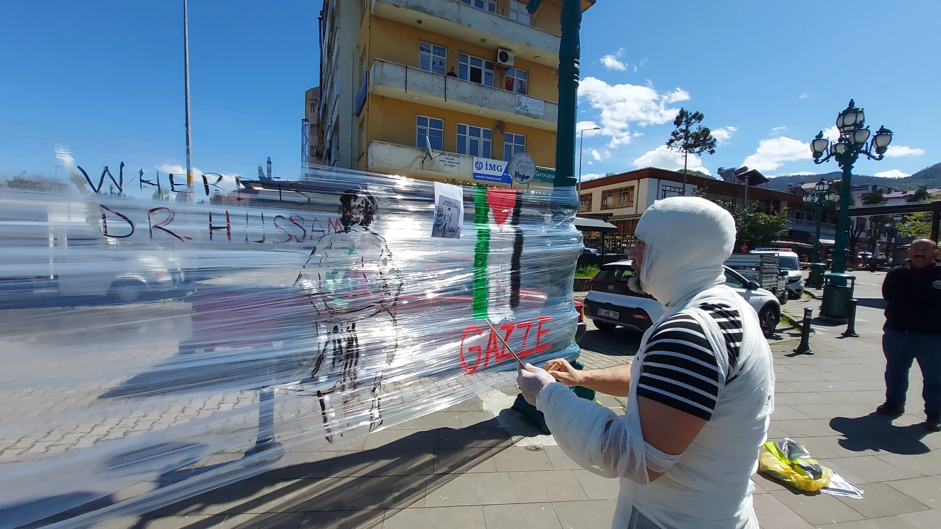 Nurbay USTA/ARHAVİ,(Artvin), (DHA)- ARTVİN'in Arhavi ilçesinde, akademisyen Doç. Dr. Kemal Sağlam, sargı bezleriyle sarılı kostüm giyerek yaralı bir Filistinliyi canlandırıp, Gazze'de yaşananları streç filmden oluşturduğu tuvale resmetti.İsrail’in Gazze yönelik saldırılarına tepkiler sürüyor. Artvin Çoruh Üniversitesi Güzel Sanatlar ve Tasarım Fakültesi Görsel İletişim Tasarımı Bölüm Başkanı Doç. Dr. Kemal Sağlam da Gazze’de yaşananlara dikkat çekmek adına, ilçedeki merkez cami avlusunda 2 aydınlatma direği arasına streç film gerip tuval oluşturdu. Tuvale Gazze’de yaşananları resmeden Sağlam, resimlerinde sivillerin ve çadırların bombalandığı mesajlarını verdi. Tuvaline Filistin bayrağı ve Mescid-i Aksa'yı da çizen Doç. Dr. Sağlam, sargı bezleriyle sarılı kostüm giyip yaralı bir Filistinliyi de canlandırdı. Doç. Dr. Sağlam'a fakülte öğrencileri de eşlik etti. Gazze’de yaşanan insanlık dramına dikkat çekmek istediğini dile getiren Doç. Dr. Sağlam, “Son günlerde İsrail, 2 yıldır yaptığı katliamları daha büyüterek oradaki insanların bezden yapmış oldukları çadırları bile bombalamakta. Oradaki insanlar evlerini kaybetmiş durumdalar. Çadırlarda yaşam mücadelesi verirken, çoluk çocuk, bebek demeden tüm dünyanın gözü önünde insanlar öldürülüyor. Biz de bu yaşanan acı olayları bir sanatçının diliyle ifade etmek ve Gazze’deki katliamları anlatmaya çalıştık” diye konuştu. (DHA)